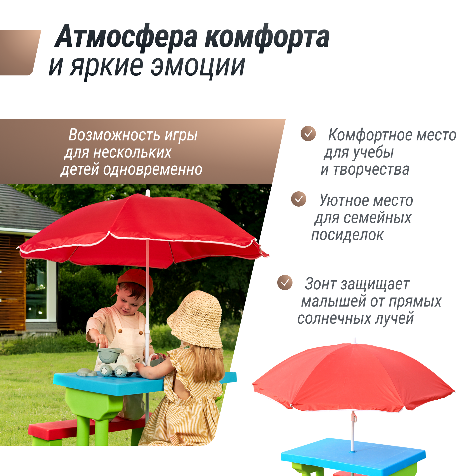 Стол детский с лавочками и зонтом UNIX Kids Garden комплект детской мебели пластиковый для дачи и улицы со столиком