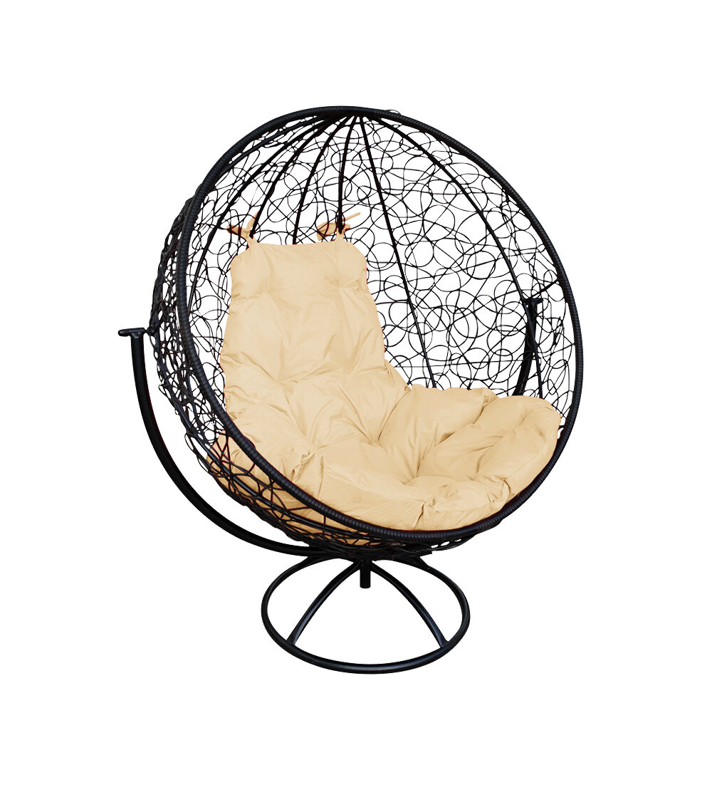 Купить Подвесное кресло-кокон с ротангом Круг чёрное, бежевая подушка
