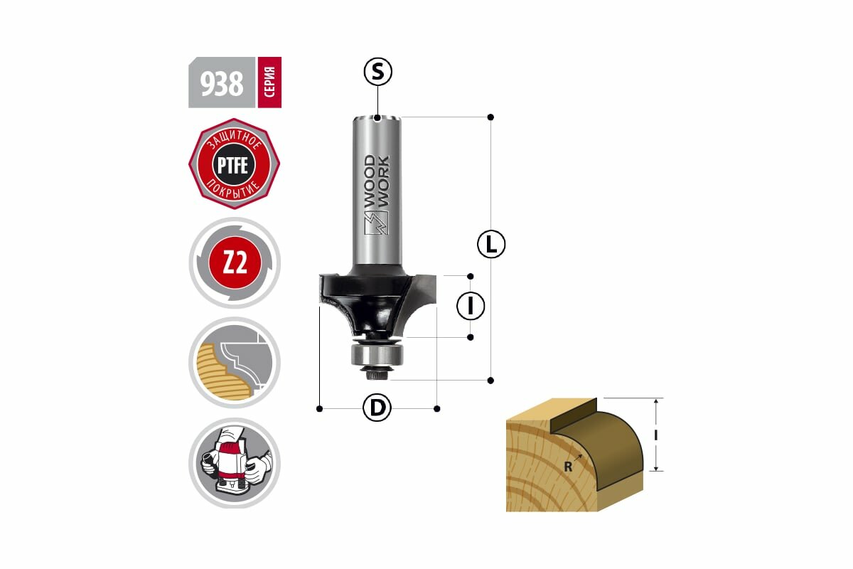 Фреза радиусная с подшипником R12.7 D38.1 L68 S12 Woodwork 938.1238.12