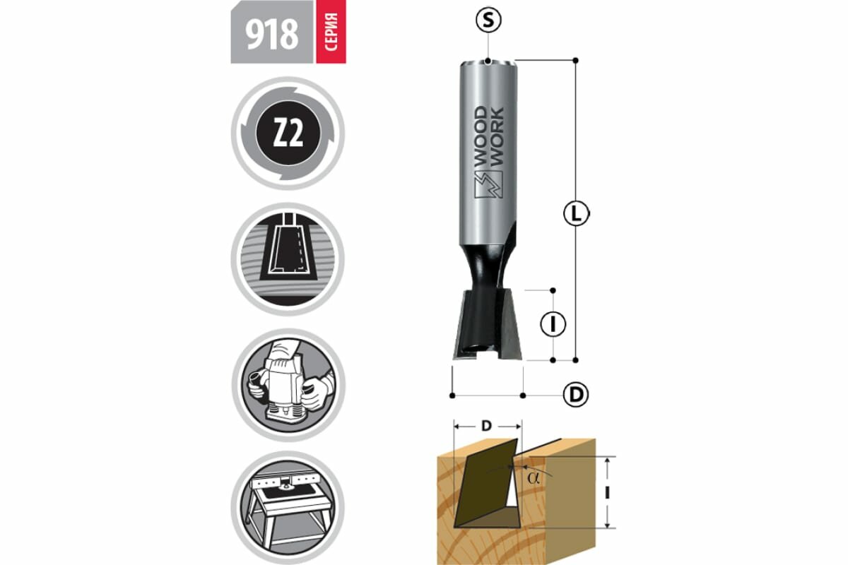 Фреза ласточкин хвост D-9,5 S-8mm угол-9 WOODWORK 918.9509.08