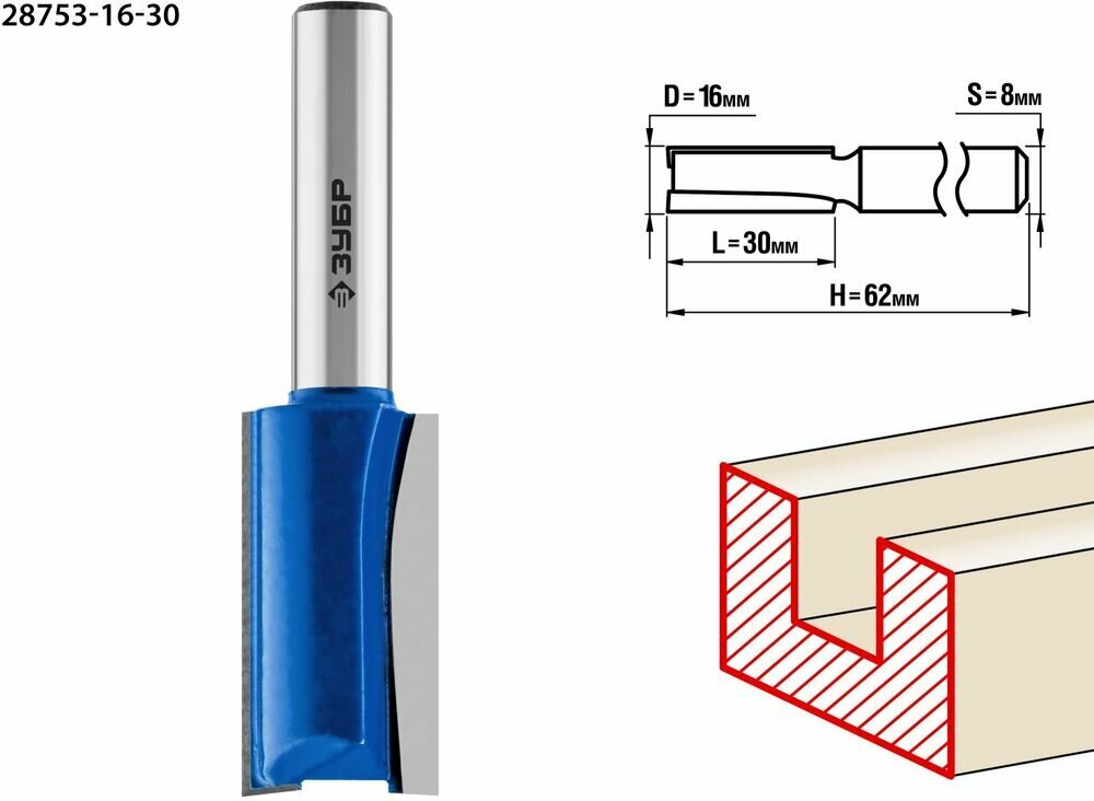 ЗУБР 16x30мм, хвостовик 8мм, фреза пазовая прямая, , серия Профессионал (28753-16-30)