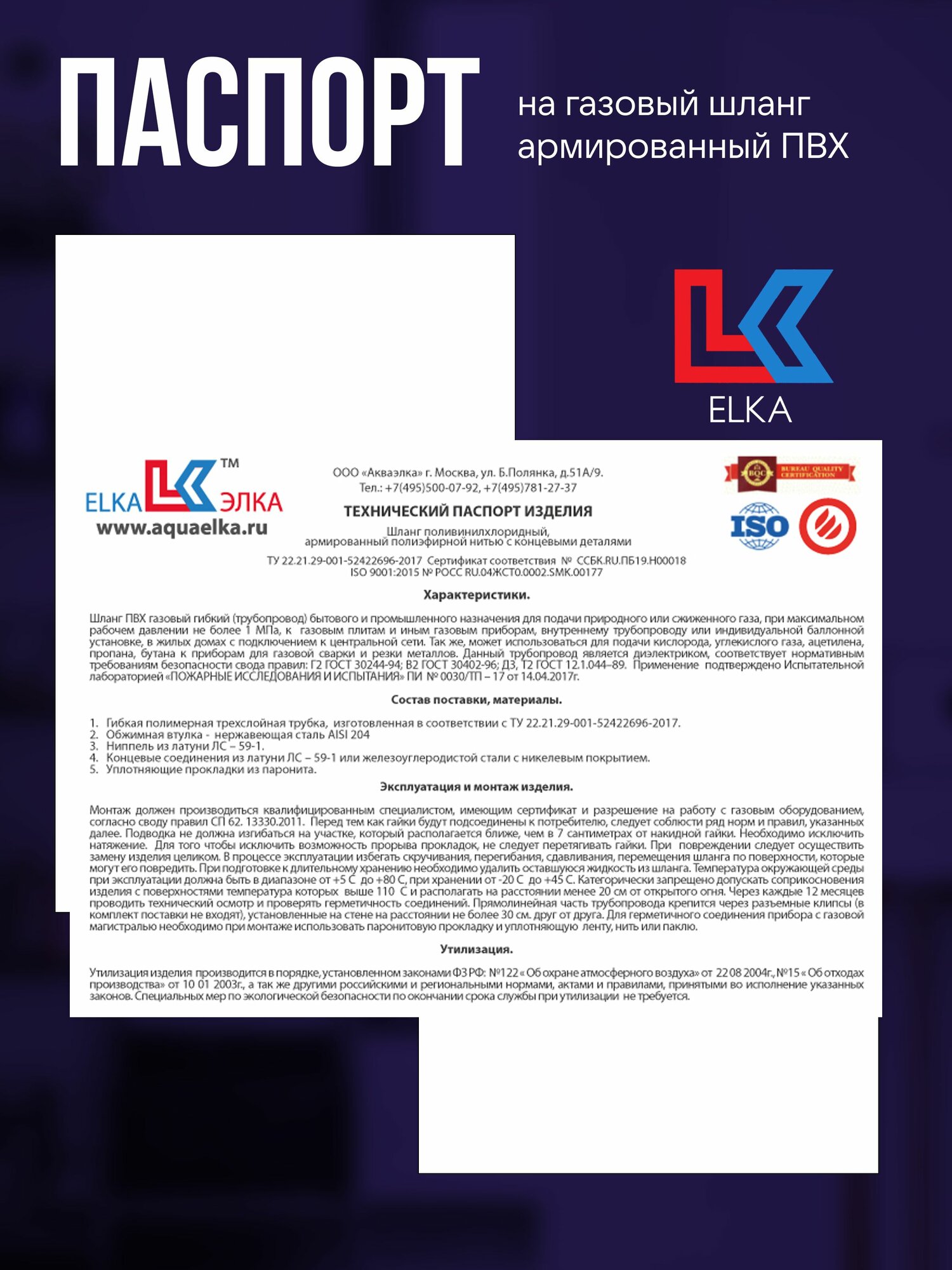 Шланг для газовых приборов 5 м ПВХ армированный ELKA 3/4" г/г (в/в) / Шланг газовый 500 см