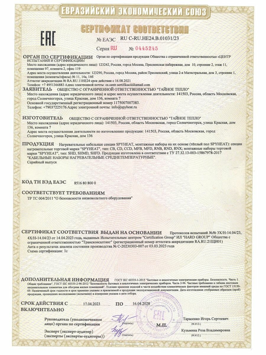 | Подробная комплектация | - нагревательная секция на основе двухжильного экранированного кабеля; - встроенный биметаллический термостат; - инструкция по эксплуатации с гарантийным талоном. |