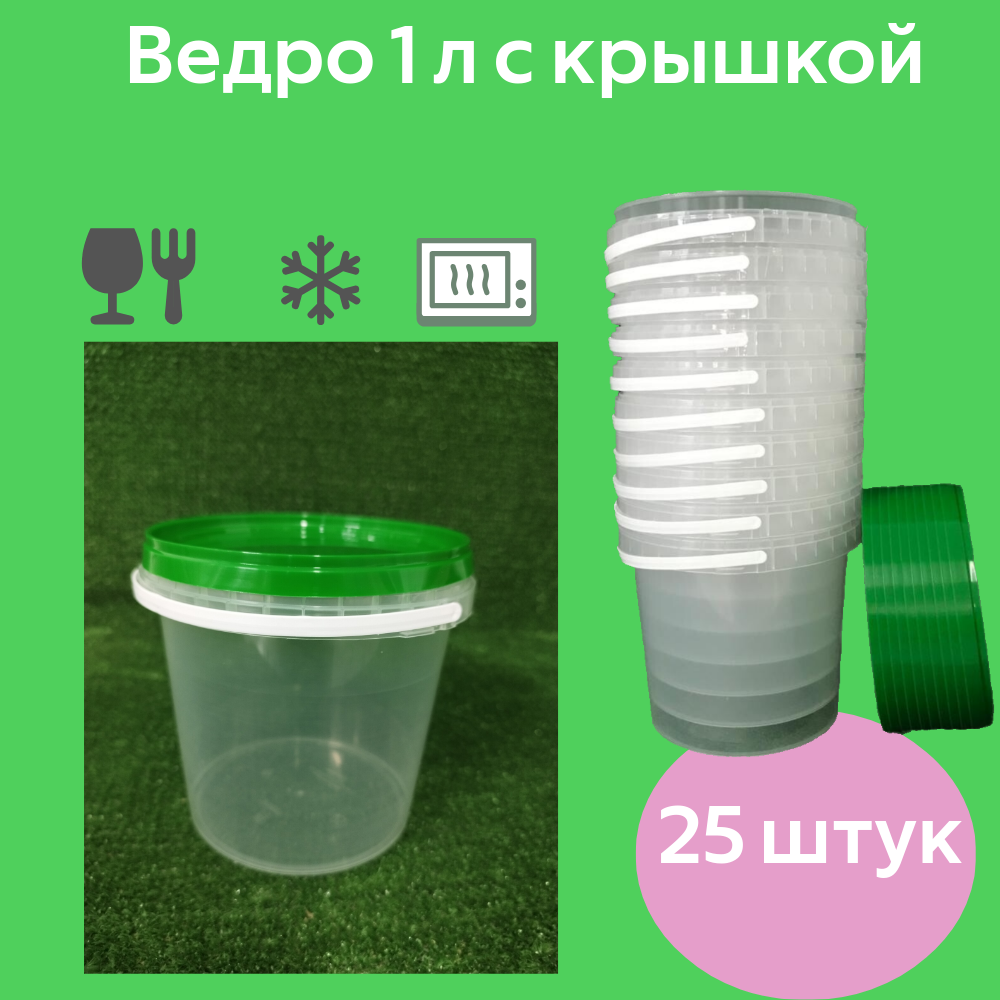 Прозрачное ведро Польза 1 литр, 25 штук в наборе с зеленой крышкой интересное: