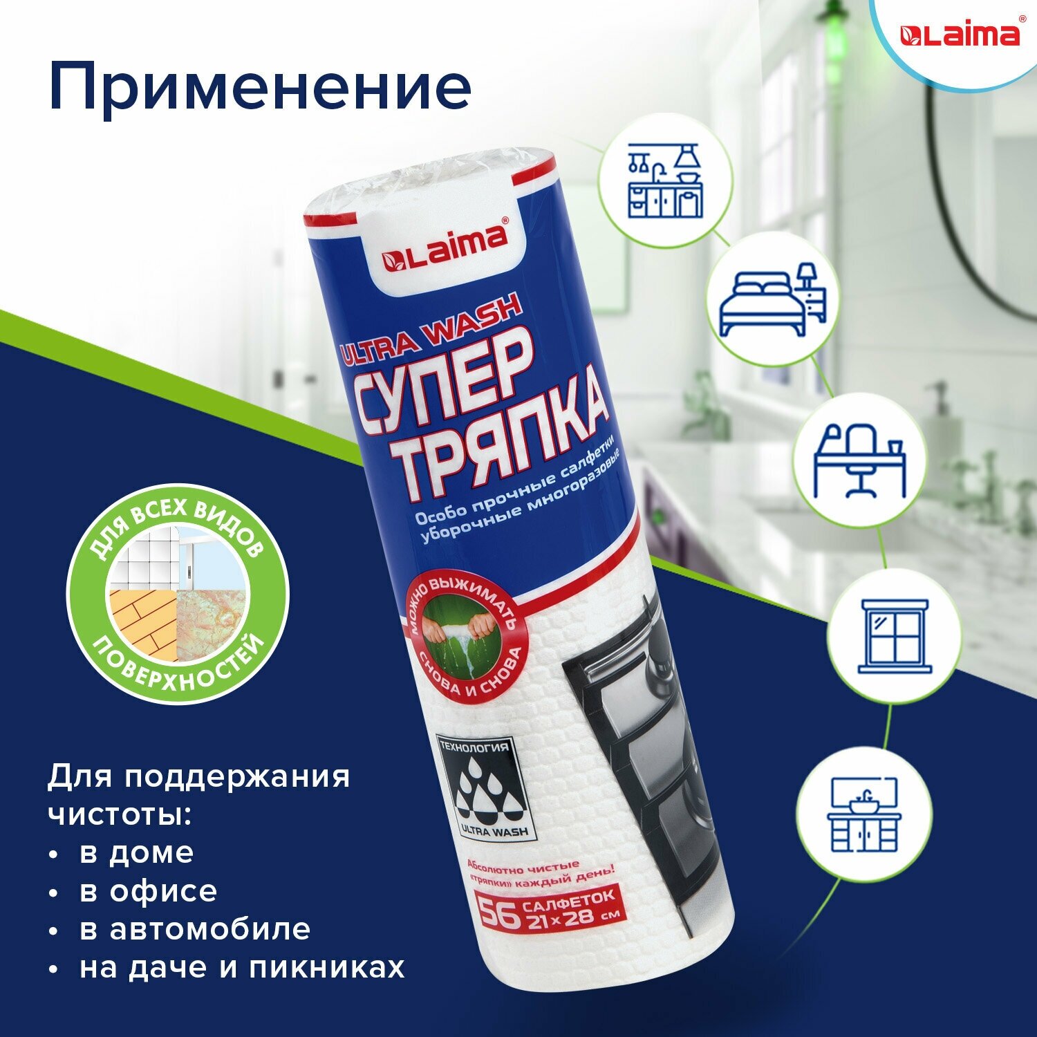 Салфетки / тряпки / полотенца в рулоне универсальные для уборки дома многоразовые особо прочные 56 штer Супер Тряпка 21х28см Laima Ultra Wash, 607996
