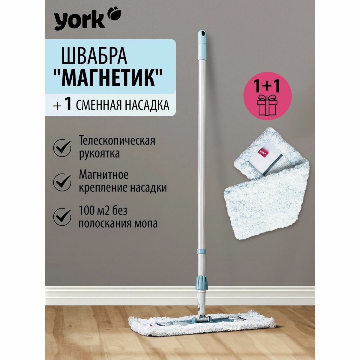 Швабра для мытья полов Магнетик York (йорк) с телескопической рукояткой 147 см, с насадкой