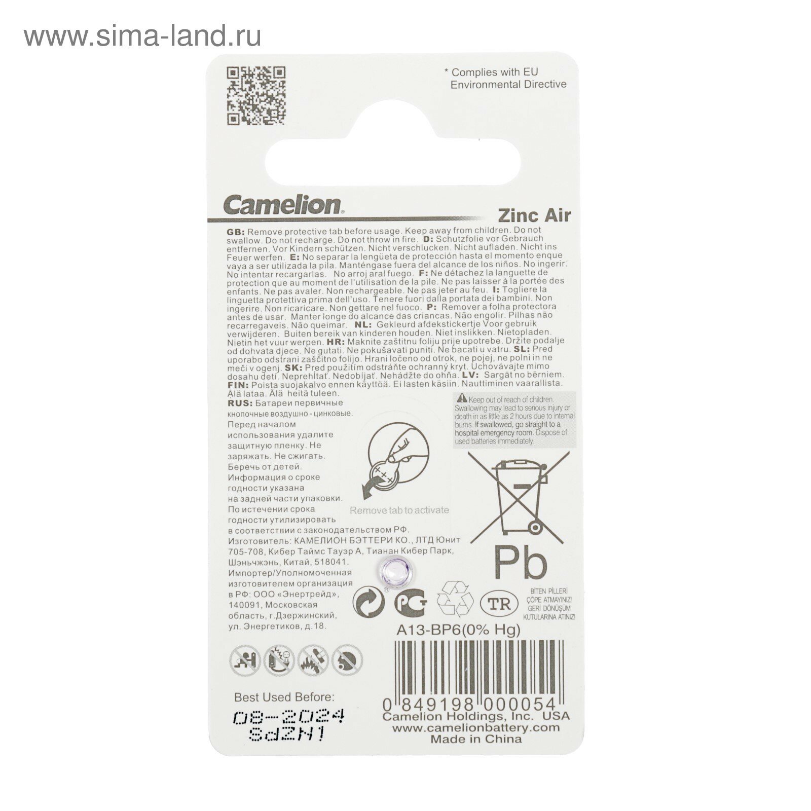 Camelion ZA13 BL-6 Mercury Free (A13-BP6(0%Hg), PR48 батарейка для слуховых аппаратов, 1.4V) (упак. 6 шт.), цена за 1 упак. интересное: