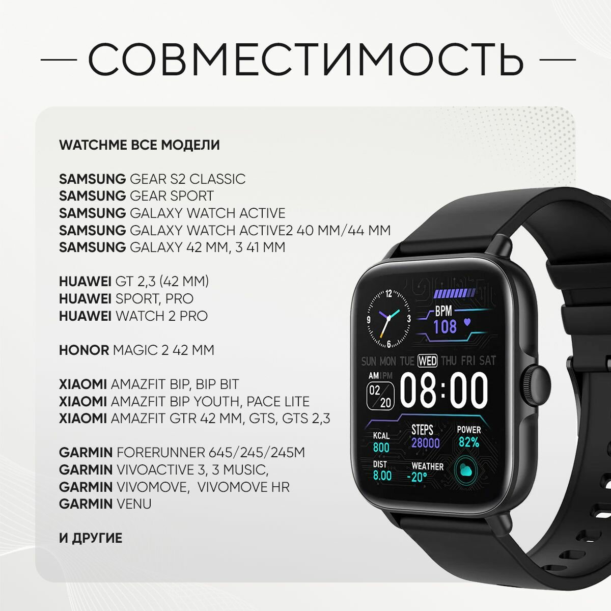 | Совместимые модели умных часов | Amazfit Arc, Amazfit Bip, Amazfit GTS |