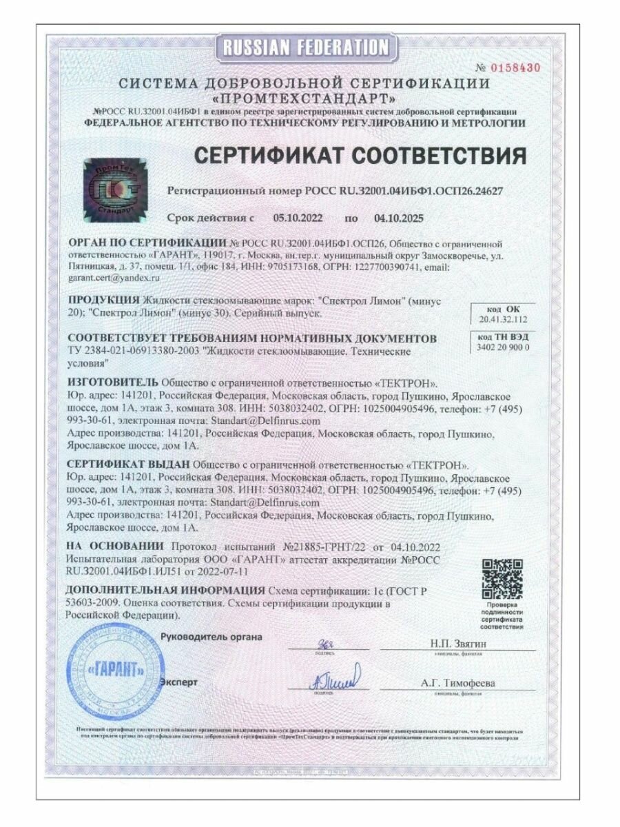 | Состав | вода деминерализованная > 30 %, изопропиловый спирт > 30 %, НПАВ < 5 %, краситель < 5 %, ароматизатор < 5 % |