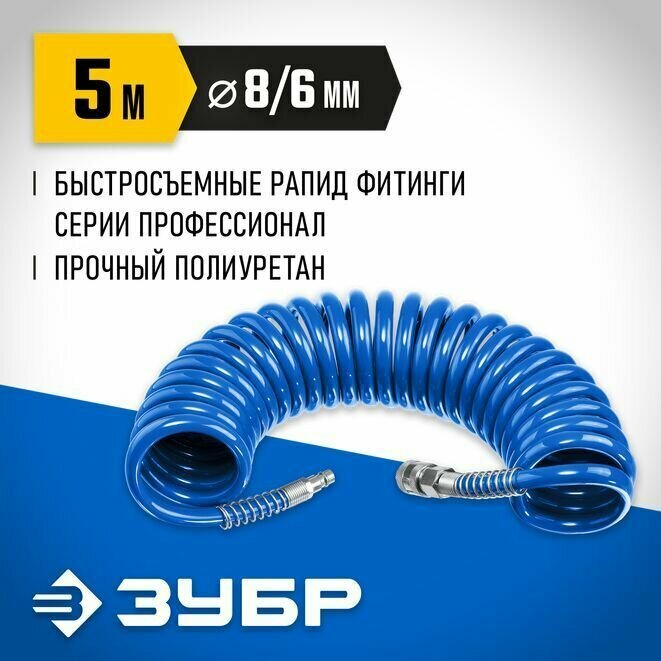 ЗУБР 5 м, 6х8 мм, 15 бар, Воздушный спиральный шланг с фитингами рапид, Профессионал (6473-05) (6473-05)
