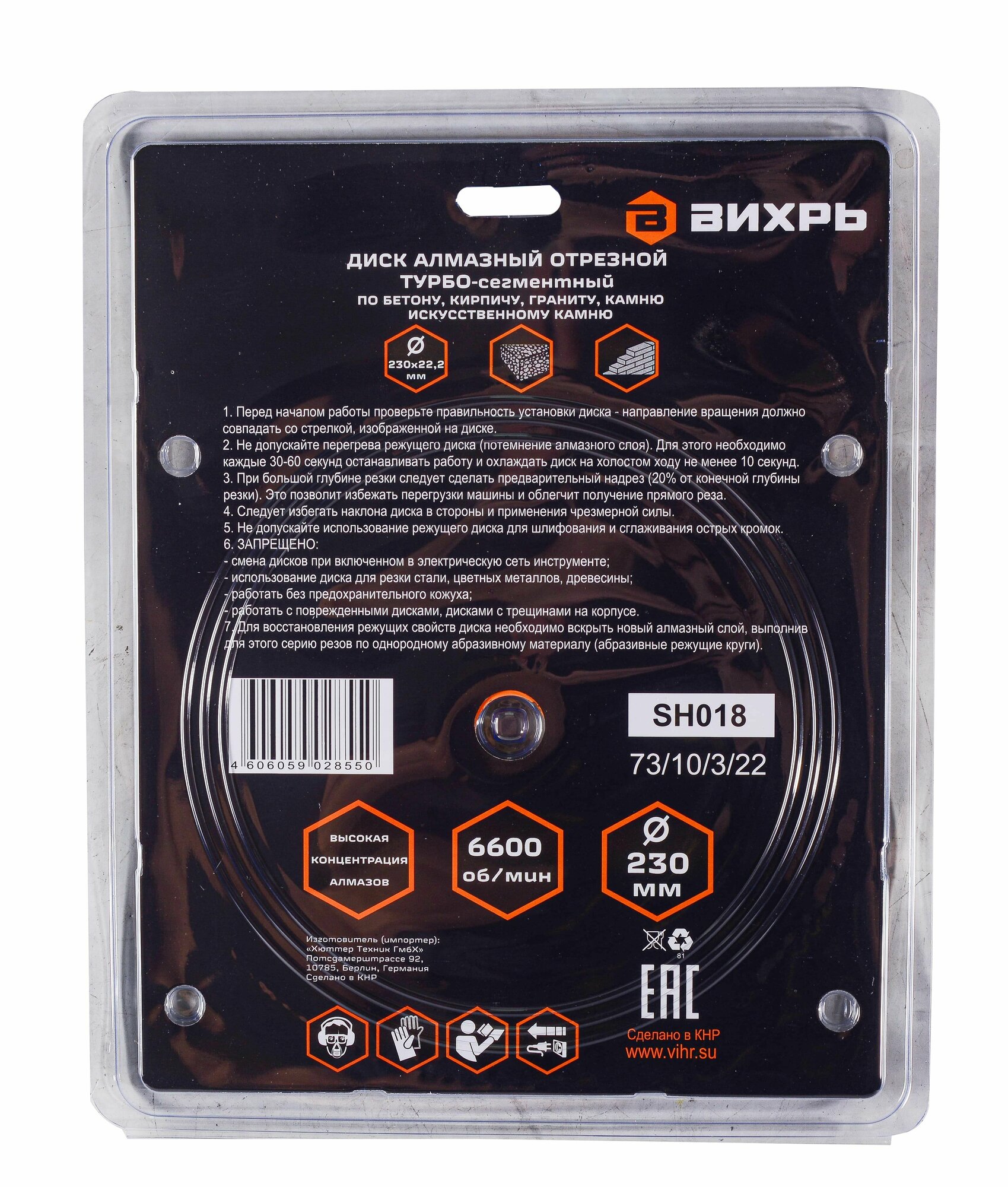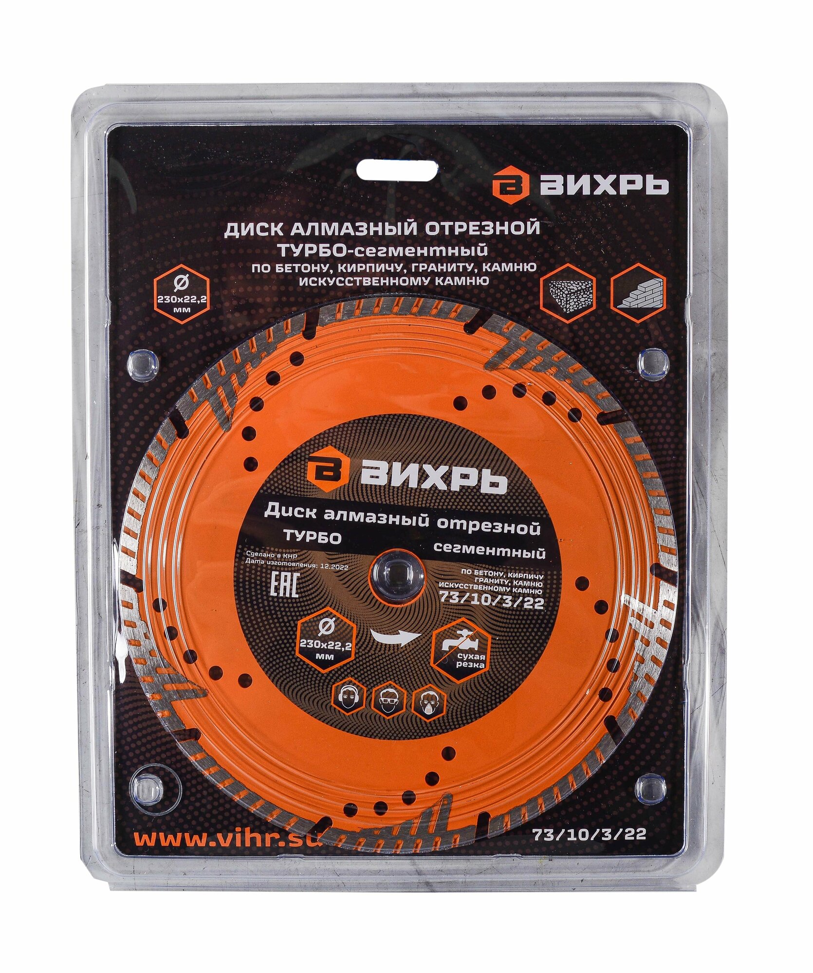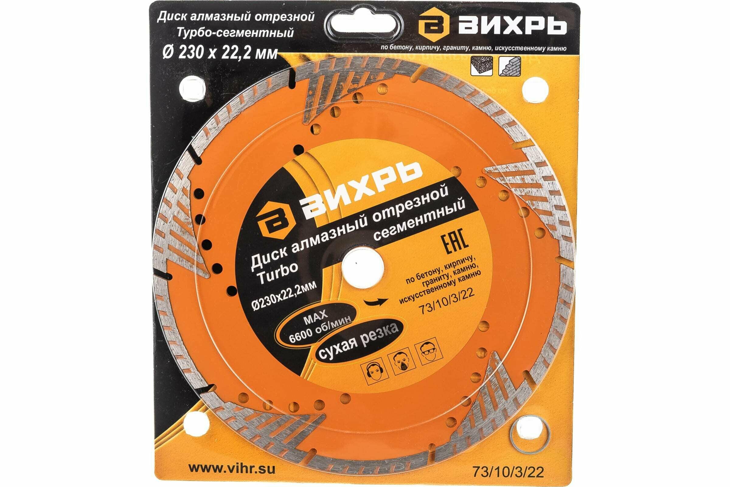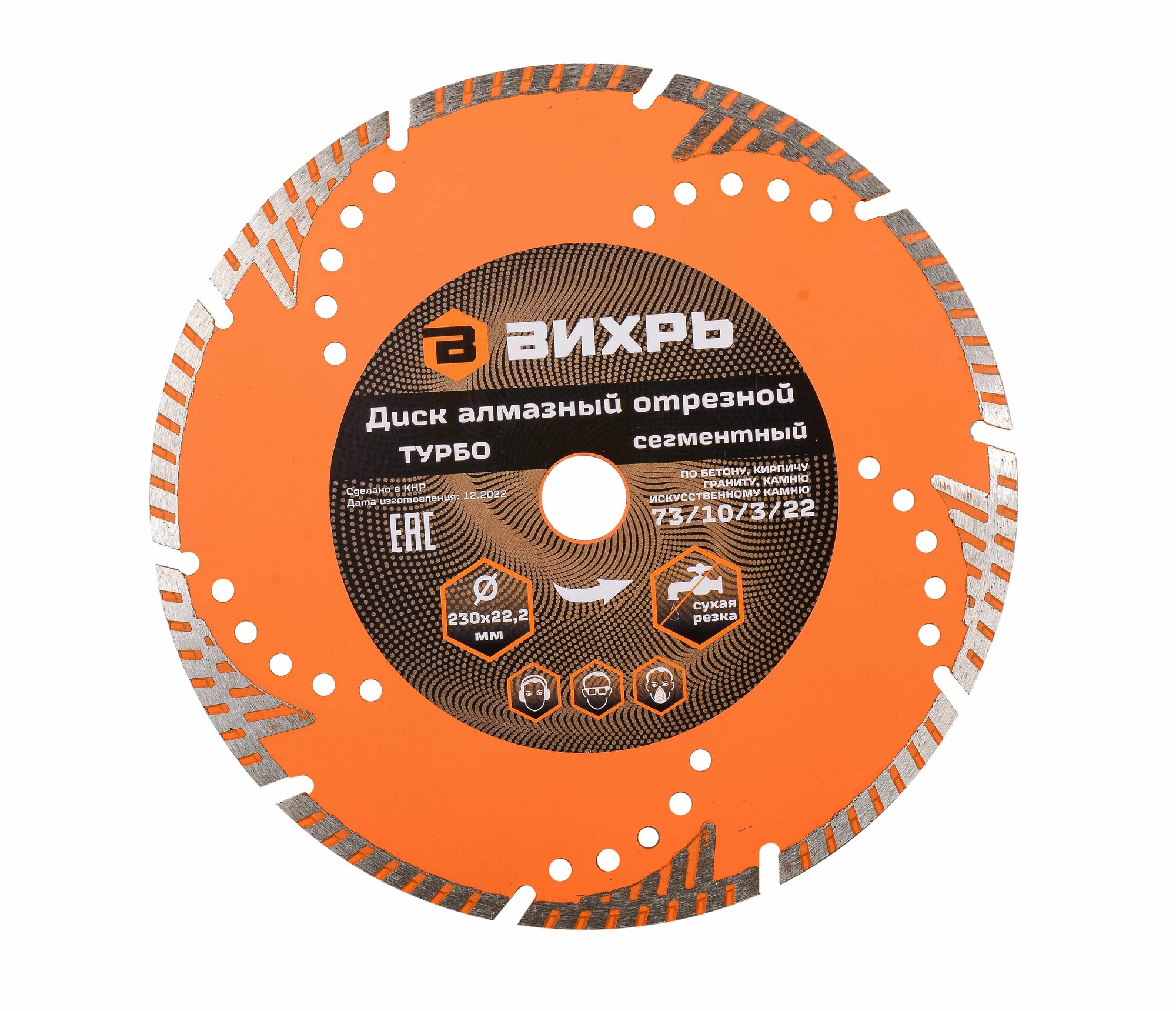 | Дополнительная информация | Диск алмазный сегментный отрезной 230 х 22,2 мм «сухая резка» Вихрь СТАНДАРТ алмазный диск для болгарки (УШМ), для штробореза 73/10/3/16 |