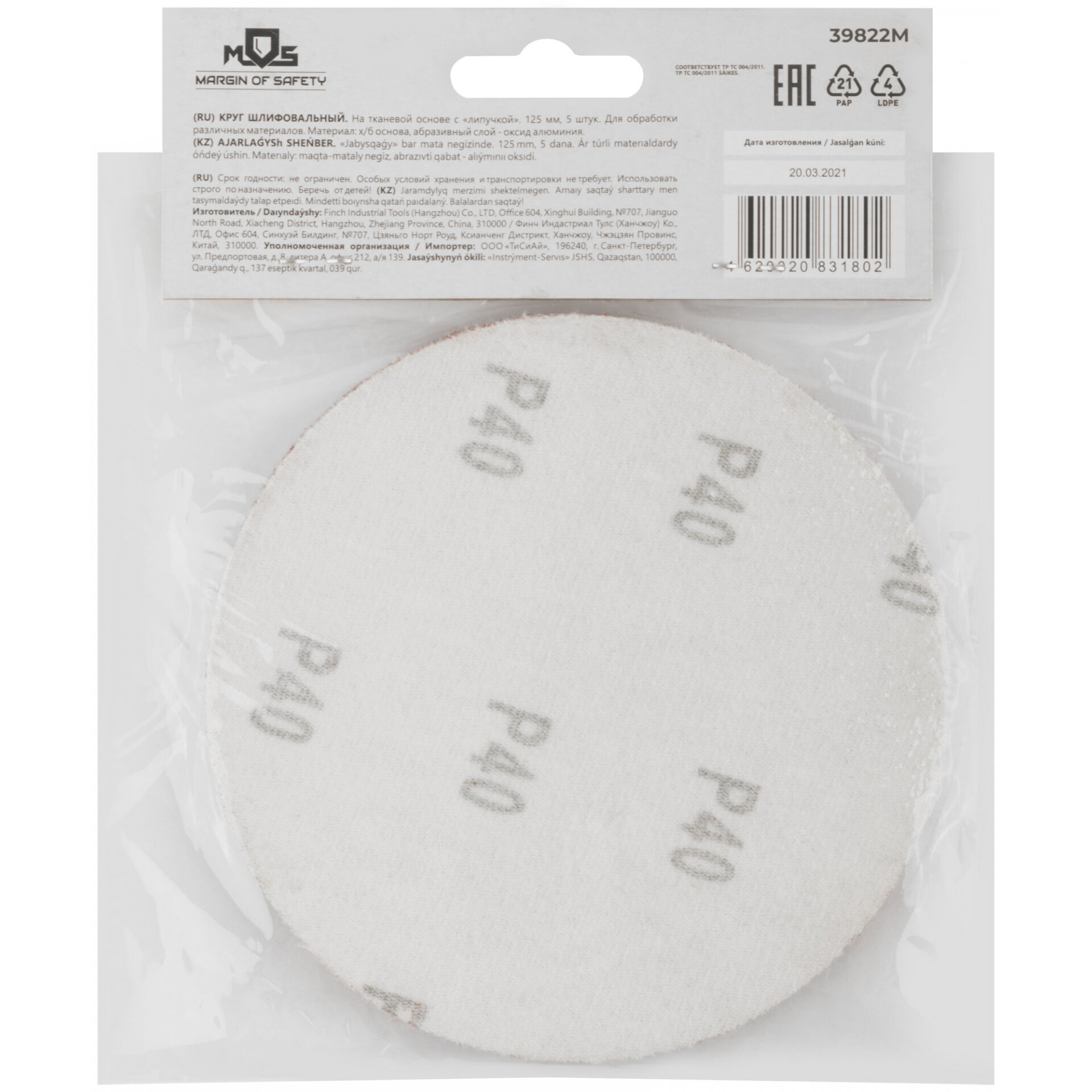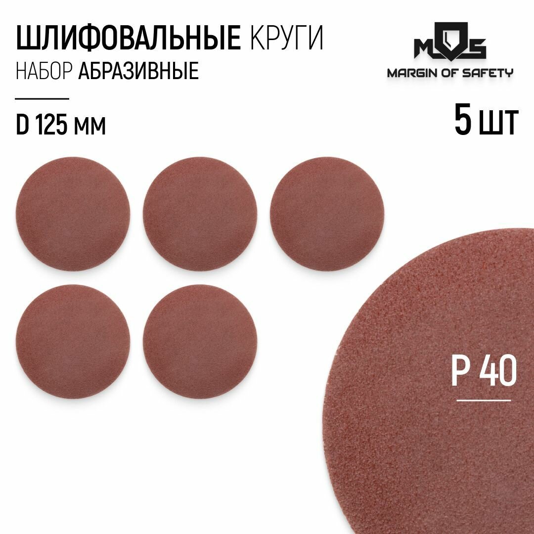 MOS Круги шлифовальные сплошные (липучка), алюминий-оксидные, 125 мм, 5 шт. Р 600 39818М