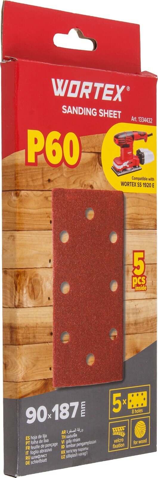 Наждачная бумага для дерева 90х187 мм Р60 шлифлисты 5 шт WORTEX (1334432)