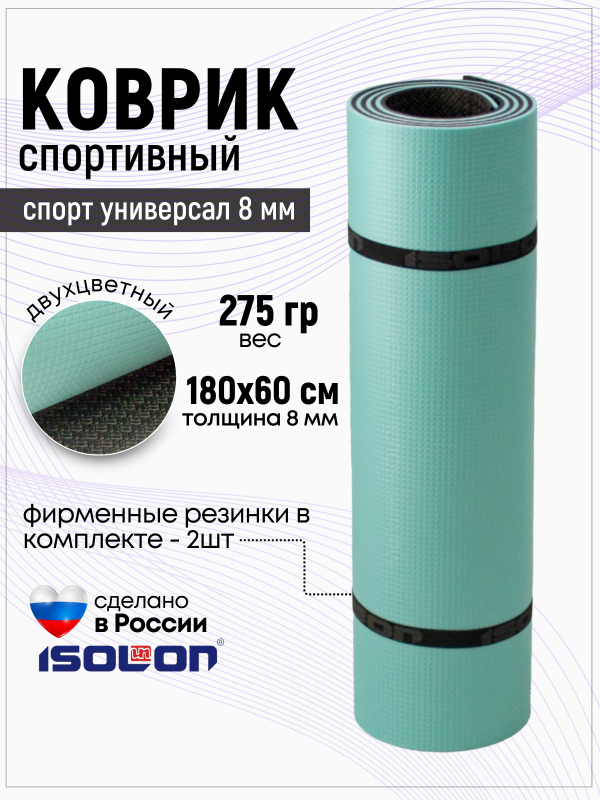 | Дополнительная информация | дополнительные принадлежности в комплекте: стяжка; подробная комплектация: Коврик спортивный Isolon Спорт Универсал 8 - 1 шт., фирменные резинки-стяжки - 2 шт.; назначение коврика: для фитнеса, для гимнастики, для пилатеса; форма: прямоугольная |