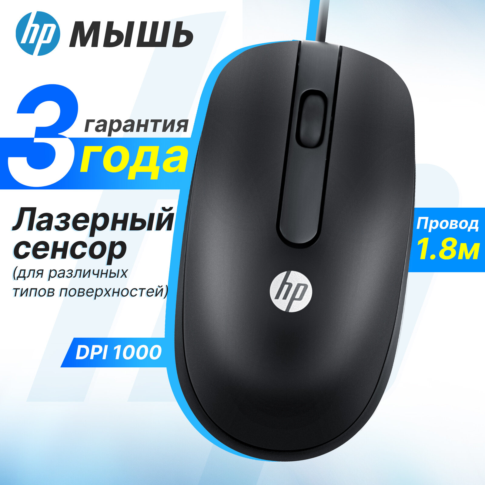 Мышь компьютерная проводная HP MSU1158,3 кнопки,1000 dpi,черная,3D,1.8 м,Лазерный сенсор