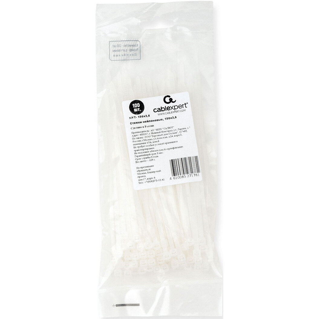 Стяжки Cablexpert пластиковые белые 150 мм х 3.6 мм (100 шт.) NYT-150x3.6