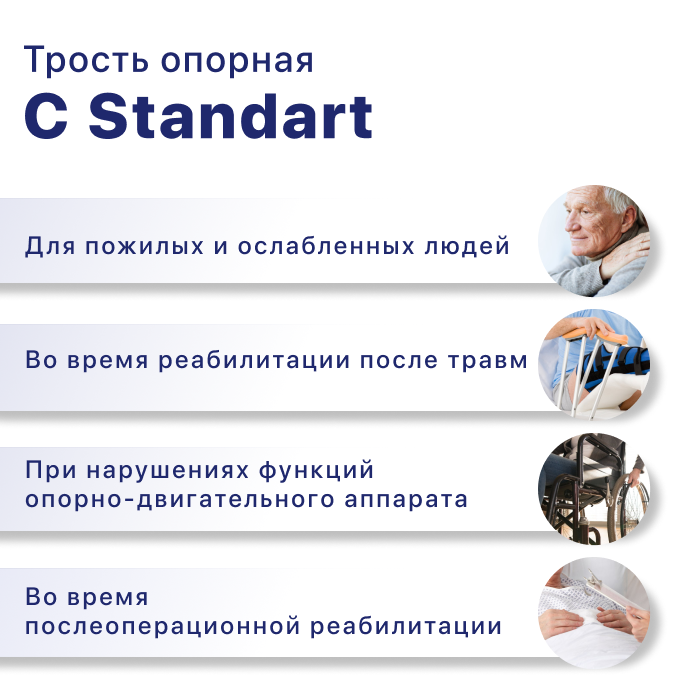 | Комплектация | Трость C Standart снабжена резиновым наконечником против скольжения и классической Т-образной рукояткой. |