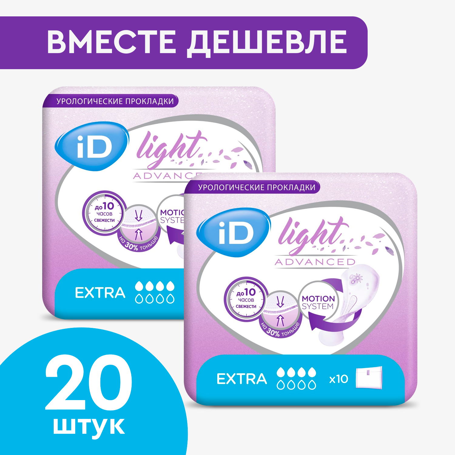 Купить Прокладки урологические женские iD Light Advanced Extra, 2 упаковки по 10 штук