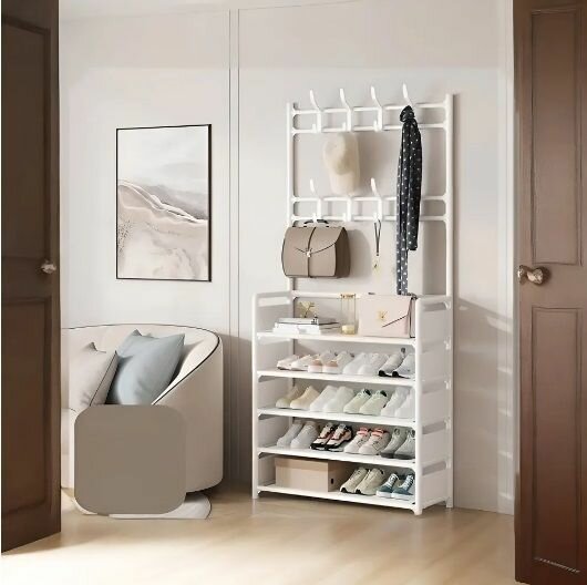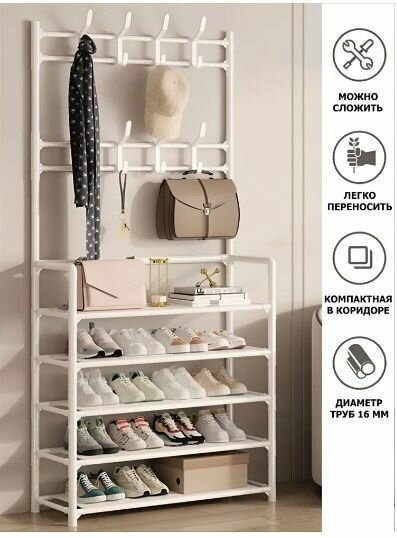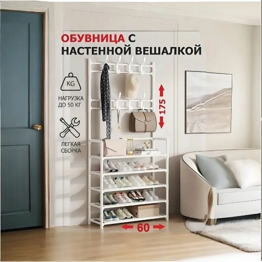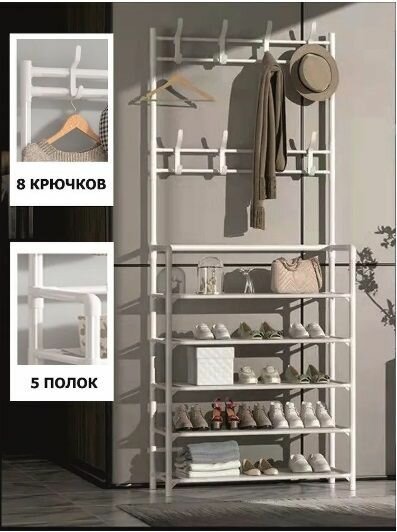 Обувница с вешалкой настенной 60х26х175 см, этажерка, полка для обуви / Стеллаж / Вешалка напольная белая с полками в прихожую интересное: