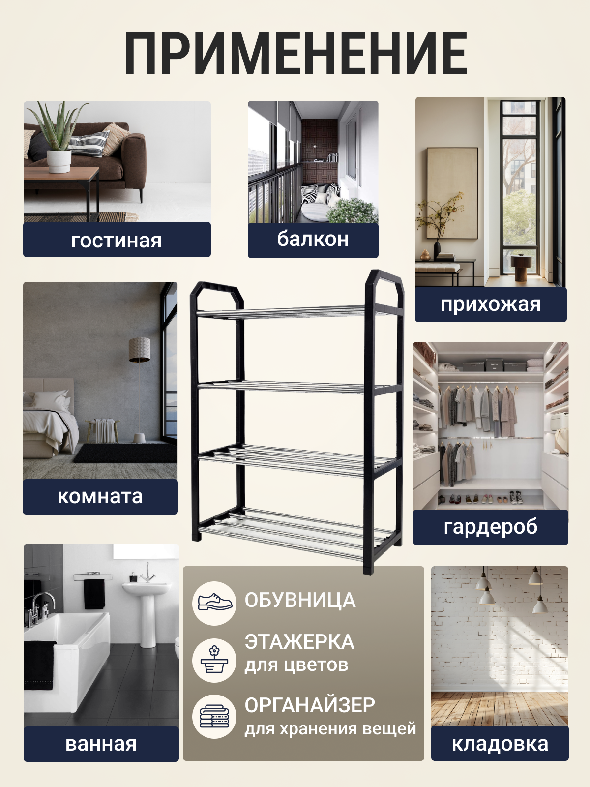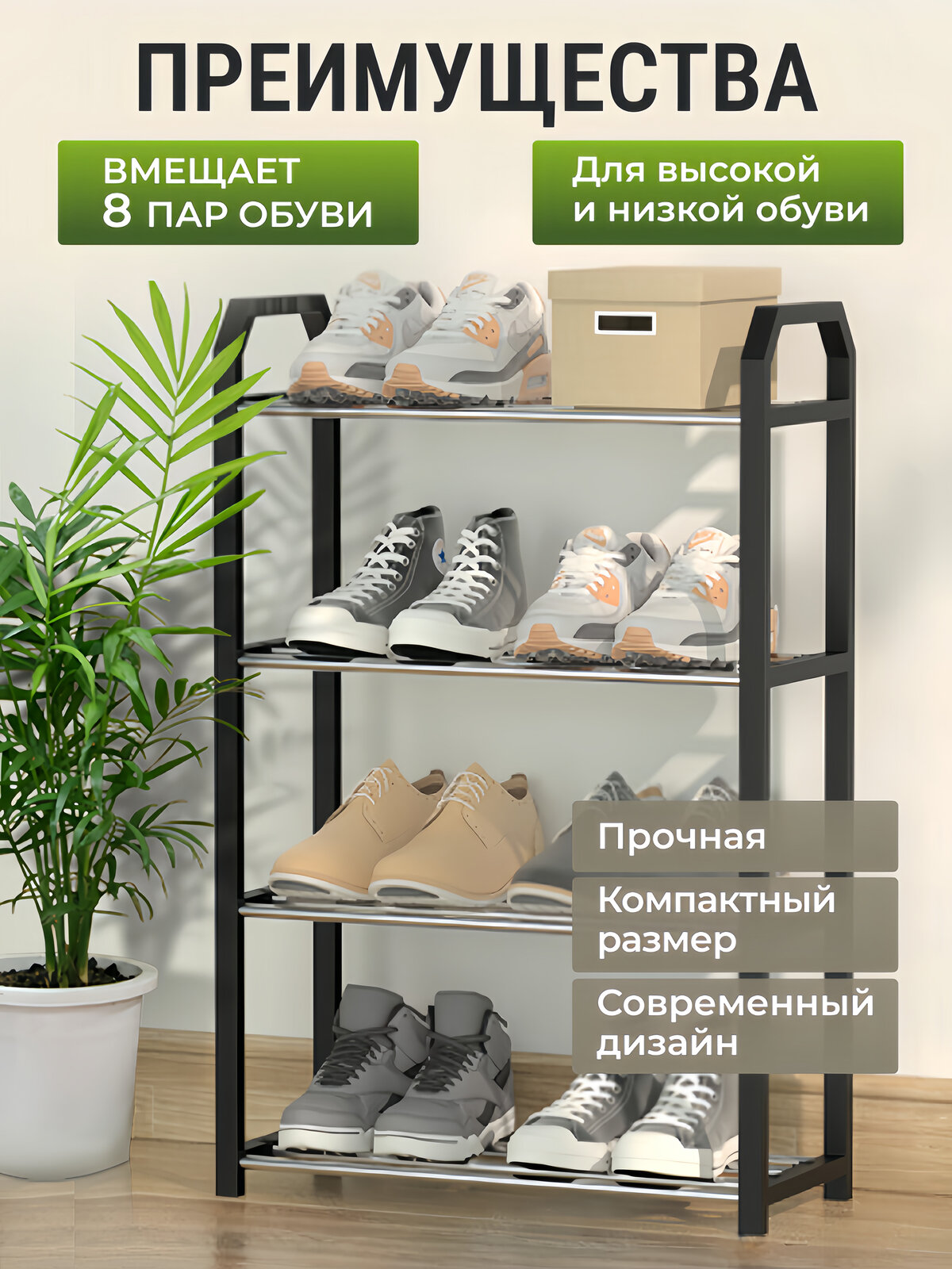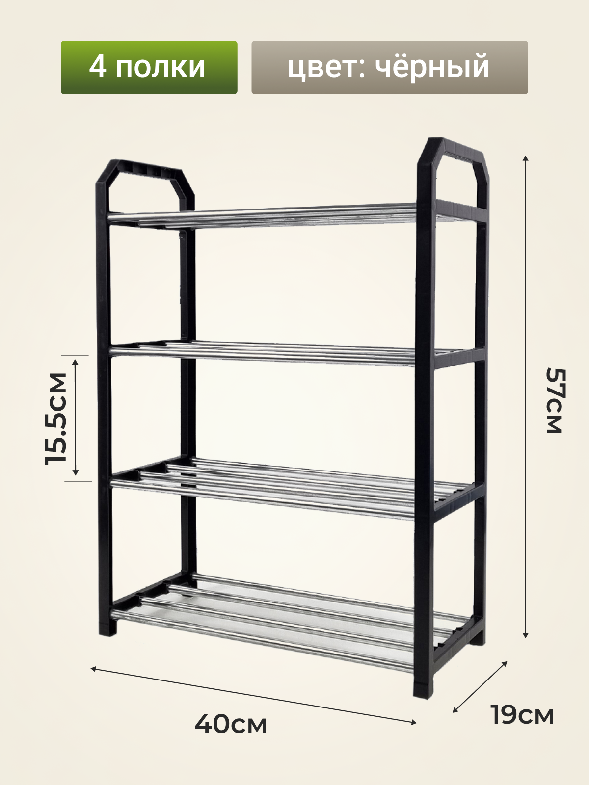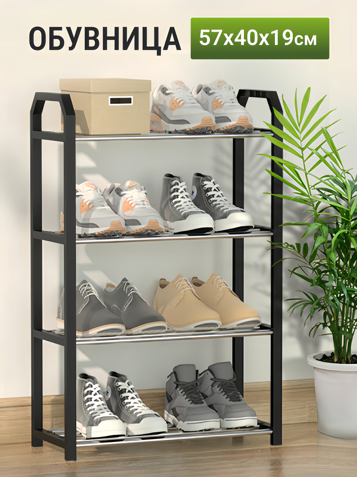 Обувница 57х40х19 см, с 4 полками, металл/пластик, черная, 8 пар интересное: