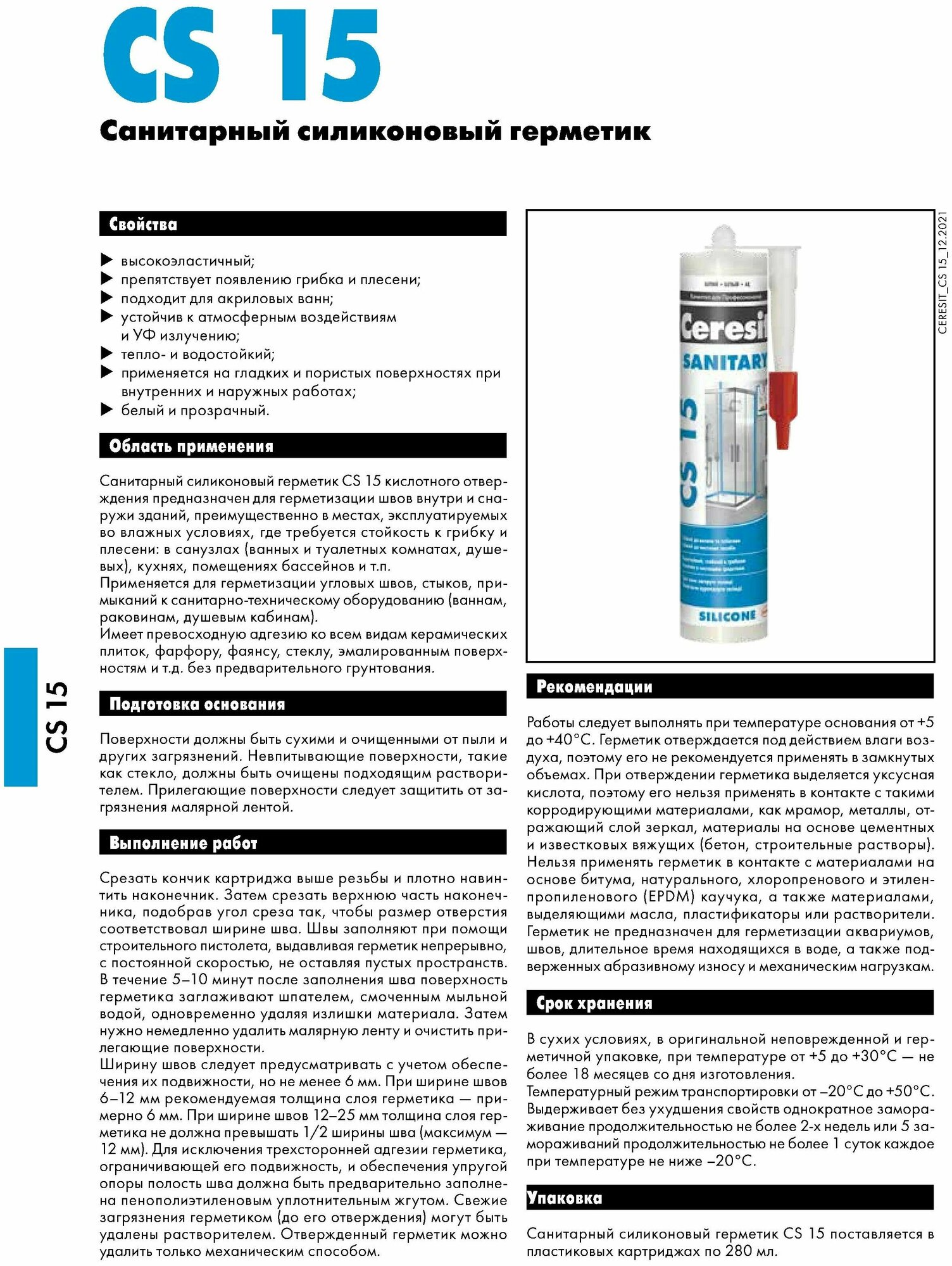 Герметик для ванной Церезит CS 15, санитарный, каучуковый герметик, прозрачный, 280 мл