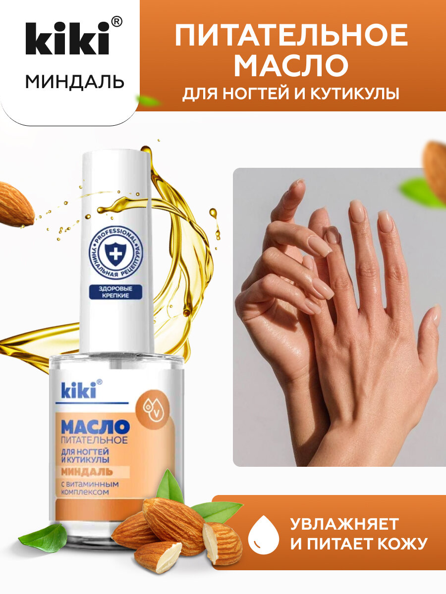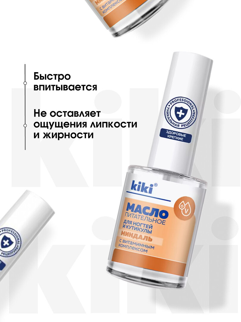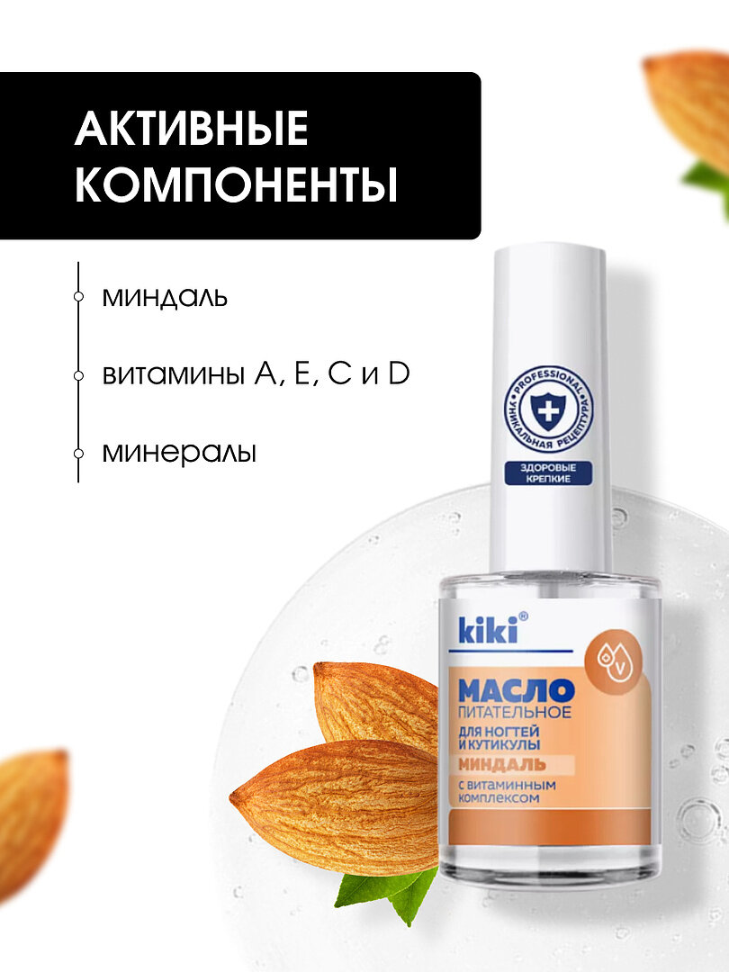 Масло для ногтей и кутикулы kiki для маникюра, педикюра, укрепление питание восстановление, с натуральным миндальным маслом и витаминами А, Е, С, D, 12 мл аромат миндаль