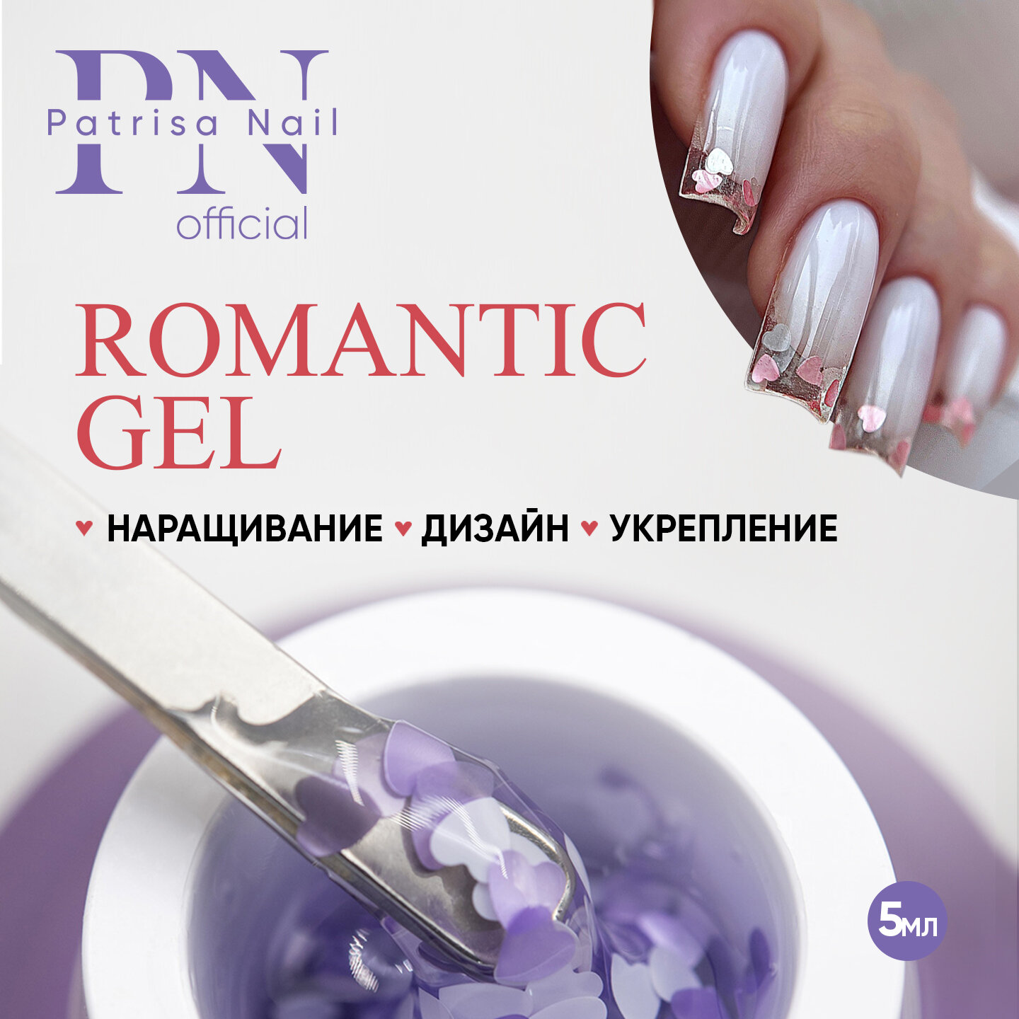 Гель с сердечками для дизайна ногтей и наращивания ROMANTIC GEL Lovers, 5 мл