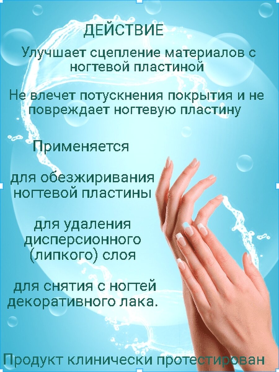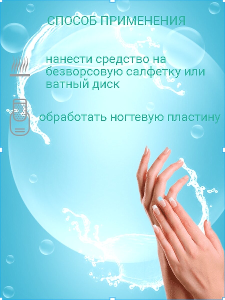 | Способ примения | нанести средство на безворсовую салфетку или ватный диск и обработать ногтевую пластину |