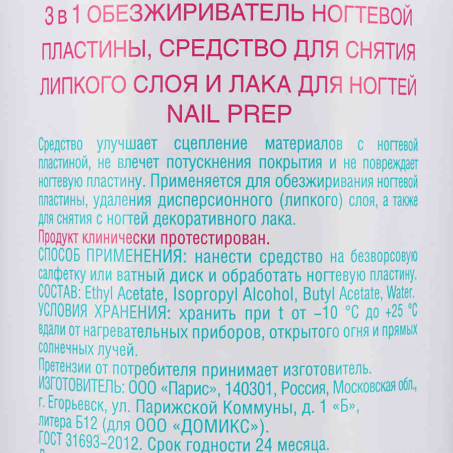 | Дополнительная информация | активные ингредиенты: этилацетат, изопропиловый спирт; не содержит формальдегиды/феноксиэтанол/агенты, высвобождающие формальдегид/альдегиды/бензол/ацетон/фталаты |