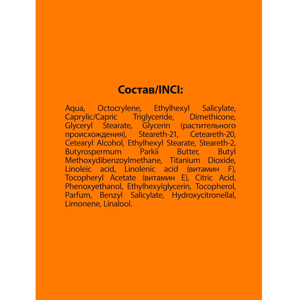 | Состав | Aqua, Octocrylene, Ethylhexyl Salicylate, Caprylic/Capric Triglyceride, Glyceryl Stearate, Vegetable Glycerin (растительного происхождения), Dimethicone, Steareth-21, Cetearyl Alcohol, Ceteareth-20, Ethylhexyl Stearate, Lanolin, Steareth-21, Butyl Methoxydibenzoylmethane, Titanium Dioxide, Phenoxyethanol, Ethylhexylglycerin, Tocopheryl Acetate (витамин Е), Linolenic Acid (витамин F), Parfum, Benzyl Salicylate, Limonene, Hydroxycitronellal, Linalool. |