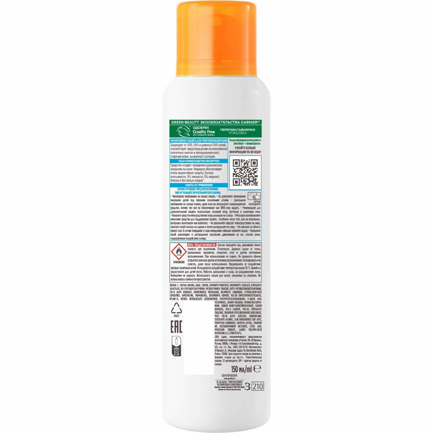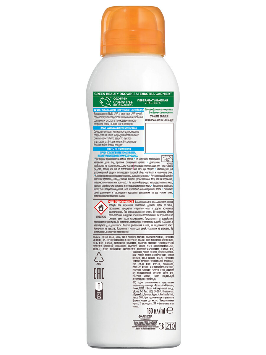 Garnier Ambre Solaire Kids Эксперт защита Спрей для нежной детской кожи солнцезащитный SPF50+ 150мл