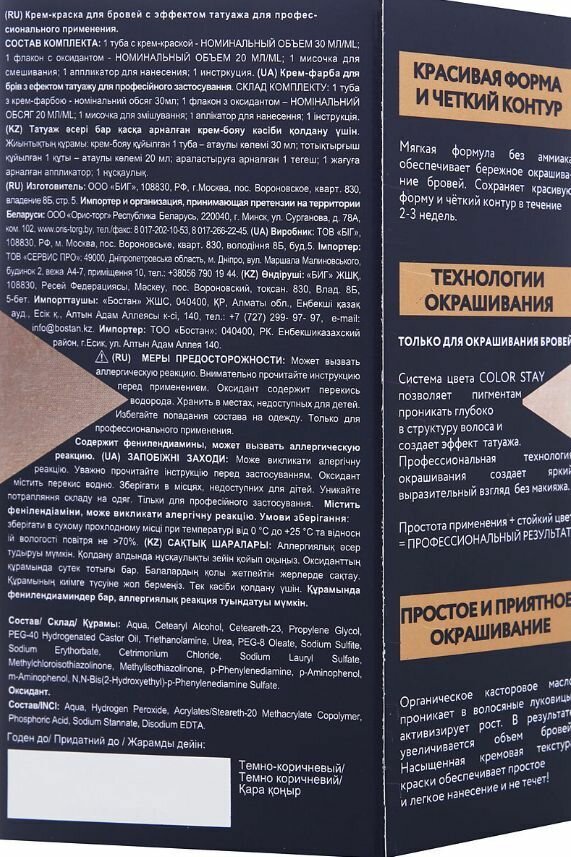 | Дополнительная информация | способ применения: перед применением проведите тест на аллергическую реакцию; не окрашивайте ресницы, только для окрашивания бровей! удалите макияж с бровей, используйте перчатки; смешайте краску с оксидантом в пропорции 2:1; при помощи аппликатора нанесите смесь на брови; оставьте смесь на 15-25 минут; удалите смесь при помощи сухого ватного диска, тщательно промойте прохладной водой |