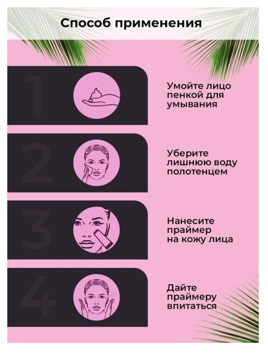 | Способ применения | Распределите небольшое количество праймера по лицу легкими массажными движениями, двигаясь от центра к периферии |