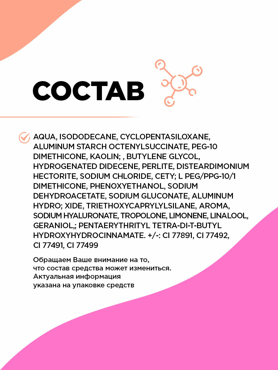 | Состав | AQUA, ISODODECANE, CYCLOPENTASILOXANE, ALUMINUM STARCH OCTENYLSUCCINATE, PEG-10 DIMETHICONE, KAOLIN, BUTYLENE GLYCOL, HYDROGENATED DIDECENE, PERLITE, DISTEARDIMONIUM HECTORITE, SODIUM CHLORIDE, CETYL PEG/PPG-10/1 DIMETHICONE, PHENOXYETHANOL, SODIUM DEHYDROACETATE, SODIUM GLUCONATE, ALUMINUM HYDROXIDE, TRIETHOXYCAPRYLYLSILANE, AROMA, SODIUM HYALURONATE, TROPOLONE, LIMONENE, LINALOOL, GERANIOL, PENTAERYTHRITYL TETRA-DI-T-BUTYL HYDROXYHYDROCINNAMATE. +/-: CI 77891, CI 77492, CI 77491, CI 77499. |