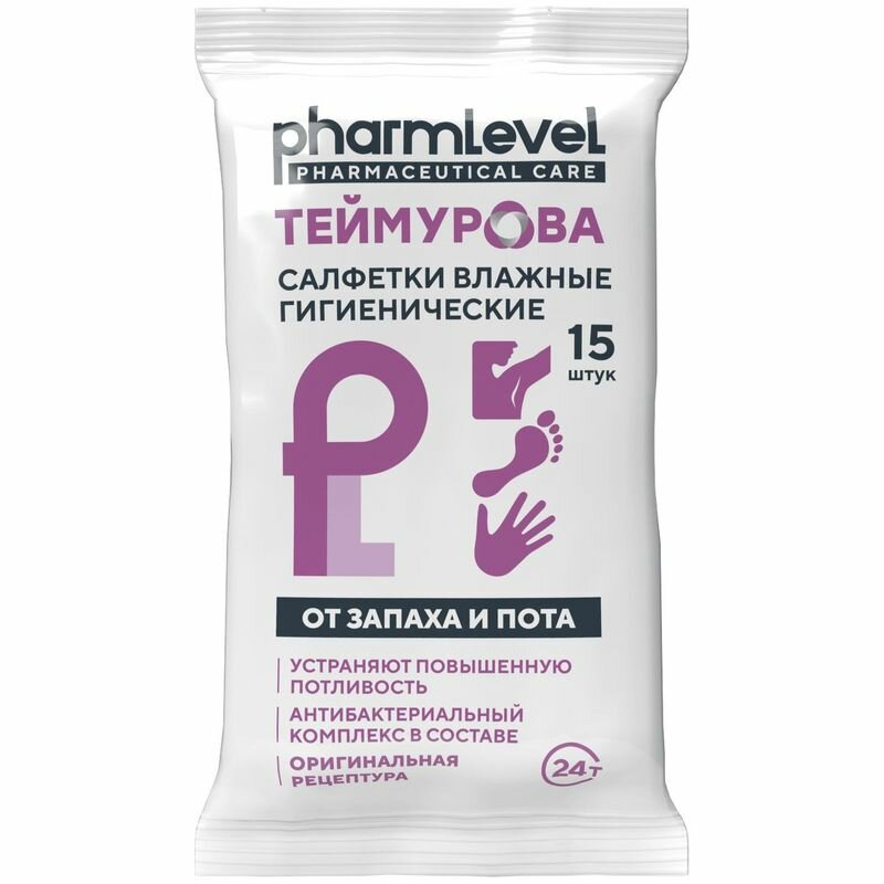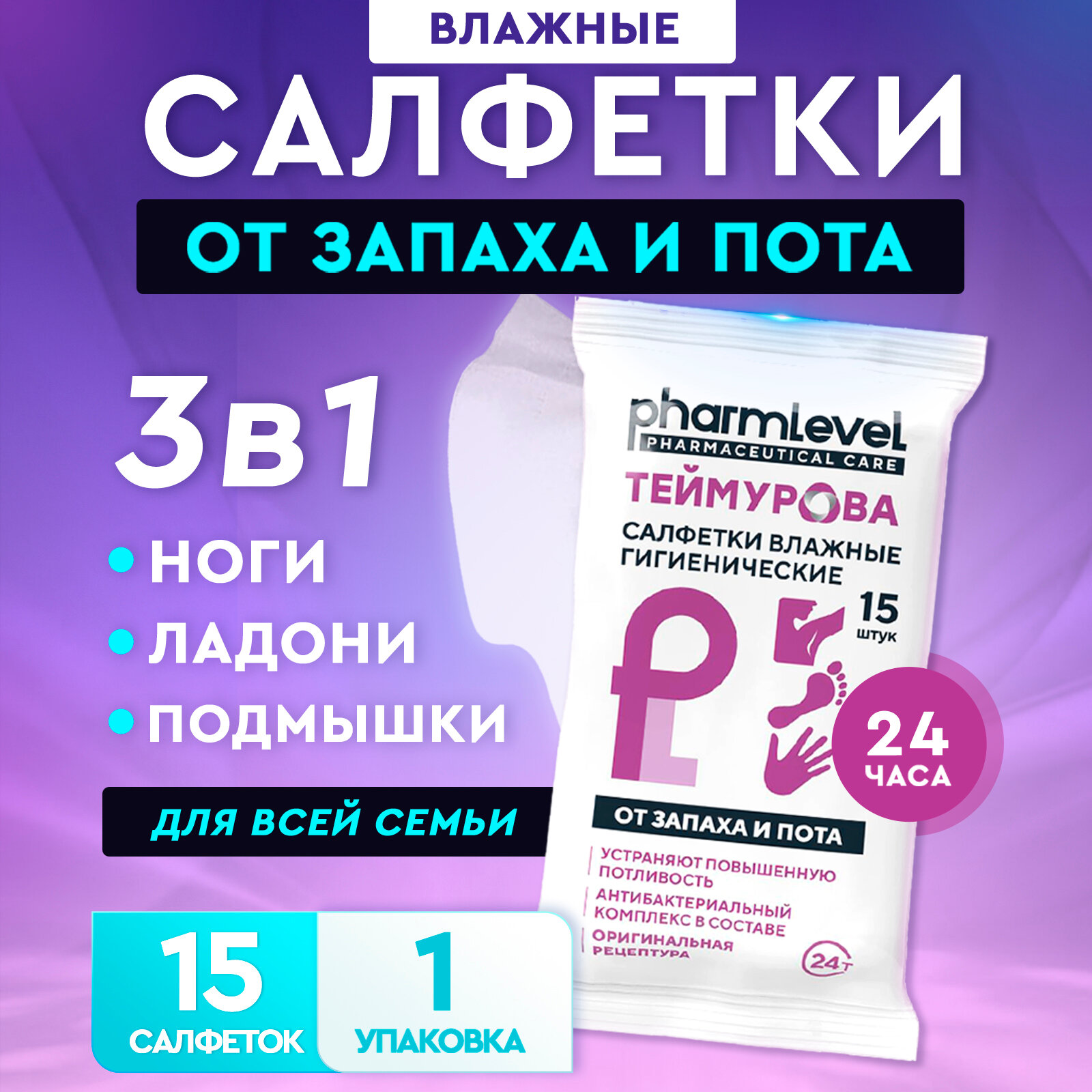 Салфетки влажные гигиенические Pharmlevel, теймурова, 15 шт, от запаха и пота, 12665