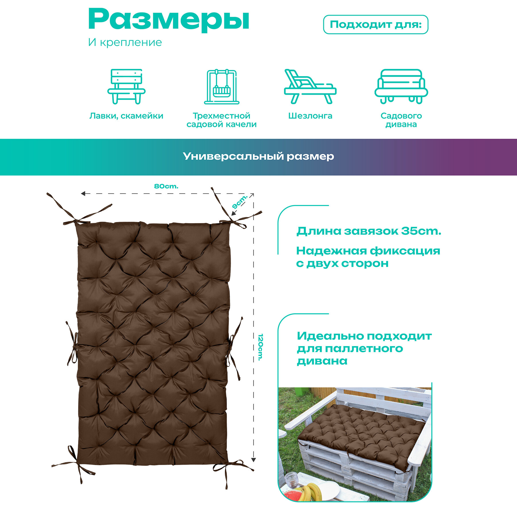 СохранитьПодушка-матрас для мебели и поддонов, матрас на подоконник 80 х 120см,водонепроницаемый,на завязках,коричневый интересное: