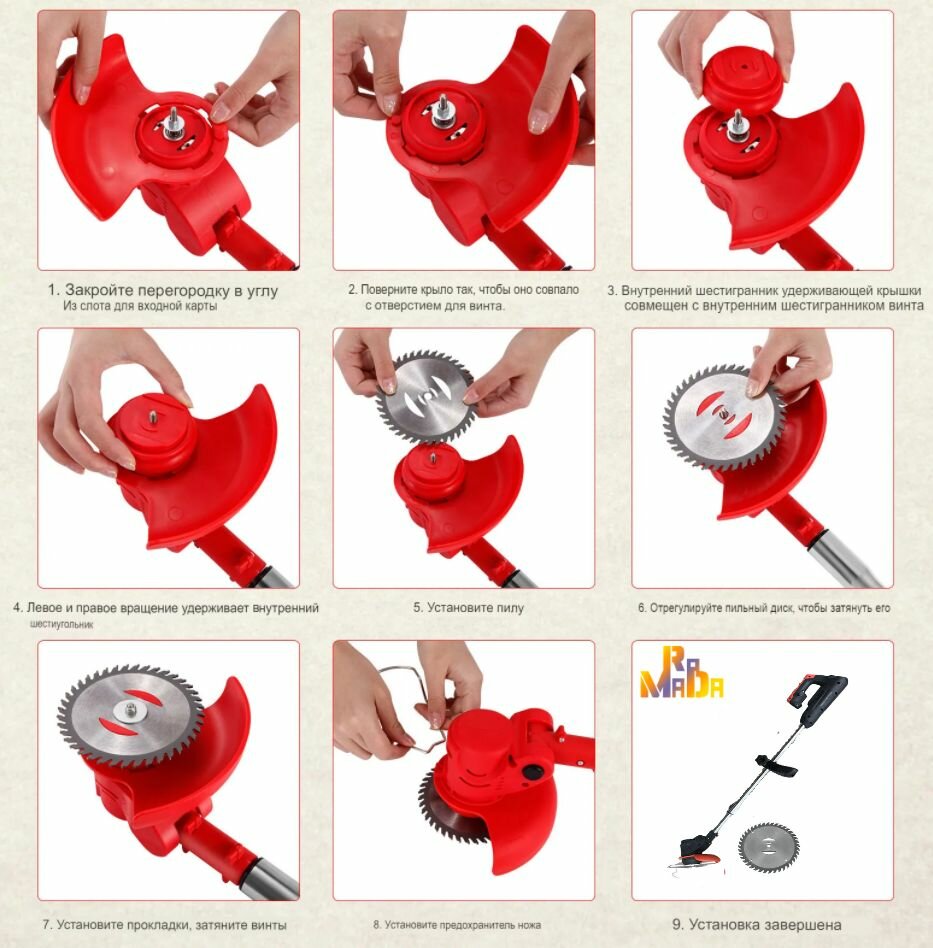| Подробная комплектация | Триммер; 1 шт. - пильный диск; 2 шт. - металлический нож; 1 шт. - 4-х конечный нож; 10 шт - пластиковый нож; 1 шт.- леска 2 уса; 1 шт.- леска 4 уса; 2 шт - аккумулятор 21 В 36VF. 1 шт - зарядное устройство 2А; ключ; ограничитель; очки; перчатки. Инструкция. |