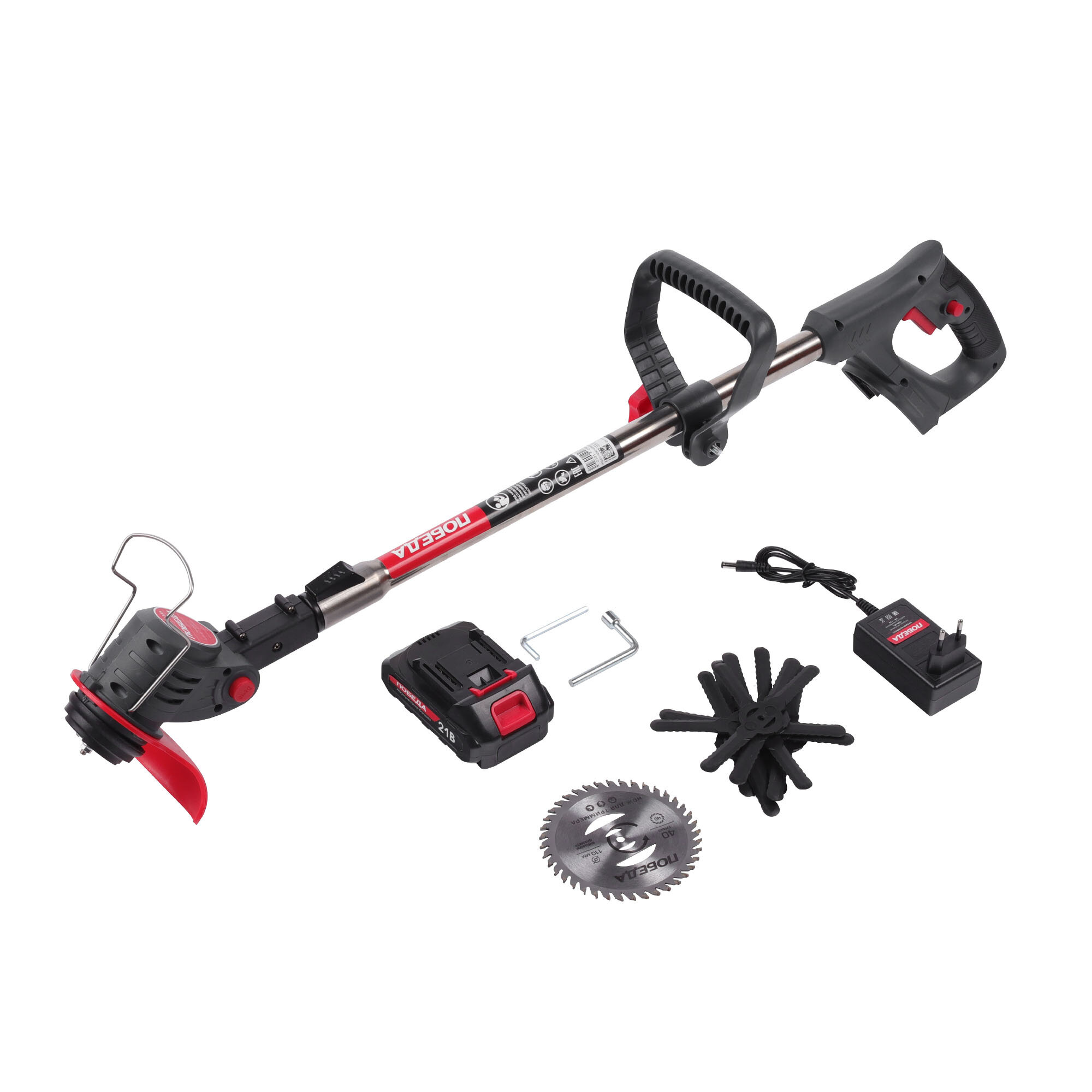 | Подробная комплектация | триммер, рукоятка, защитный кожух, набор для сборки, фиксатор рукоятки, нож триммерный (пластик) 10шт., металлический диск (сталь) 2шт., АКБ, ЗУ, инструкция |