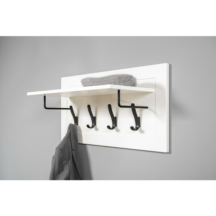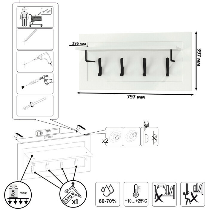 | Дополнительная информация | навесная вешалка с 4 двухрожковыми крючками и полкой для головных уборов; полка для головных уборов расположена над крючками и поддерживается двумя металлическими элементами; максимальная нагрузка на каждый крючек - 1,5 кг, на полку - 5 кг; поставляется в разобранном виде |