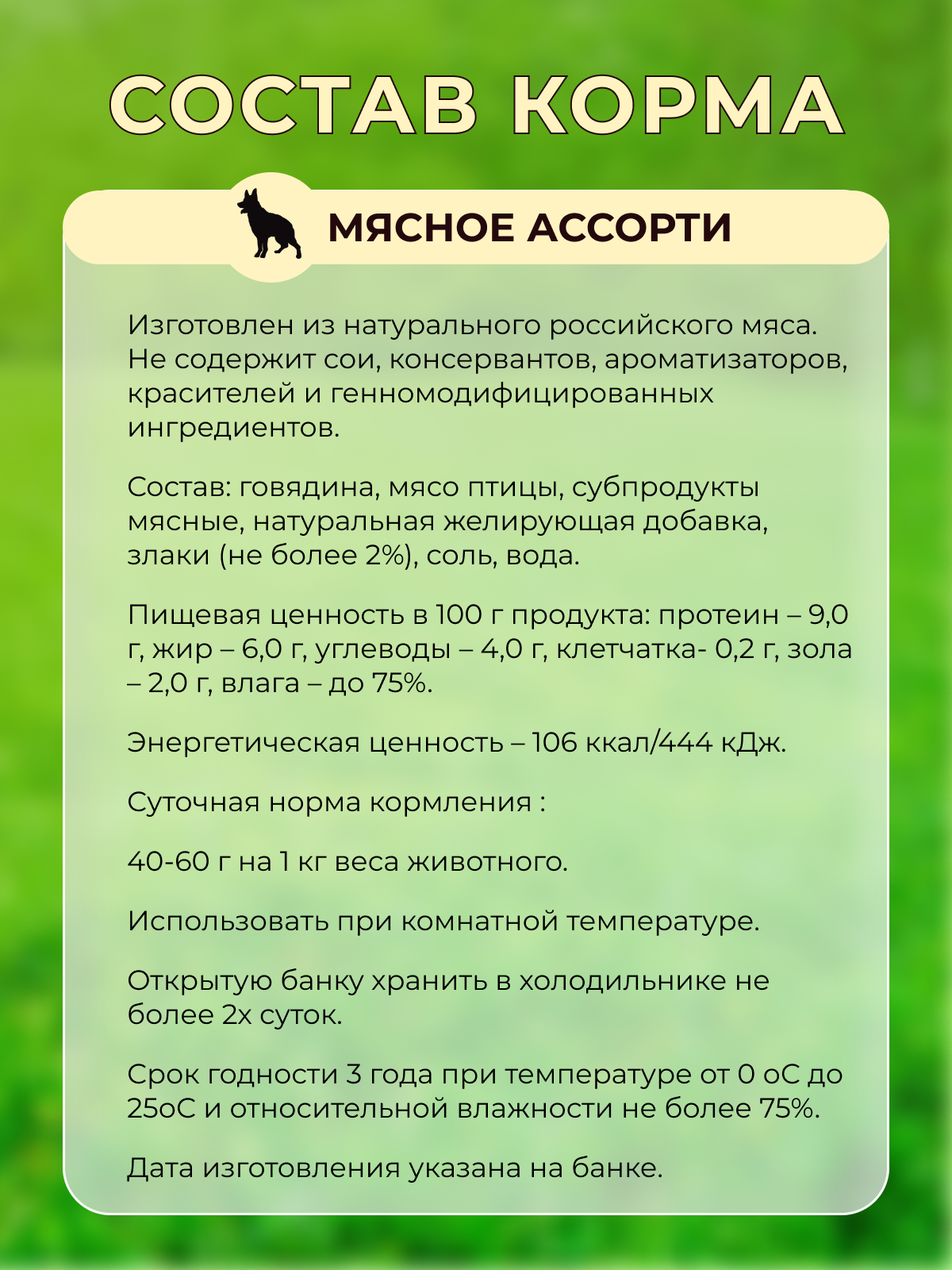 | Возраст животного | взрослые (1-6 лет) / пожилые (7+) / щенки (до 1 года) |