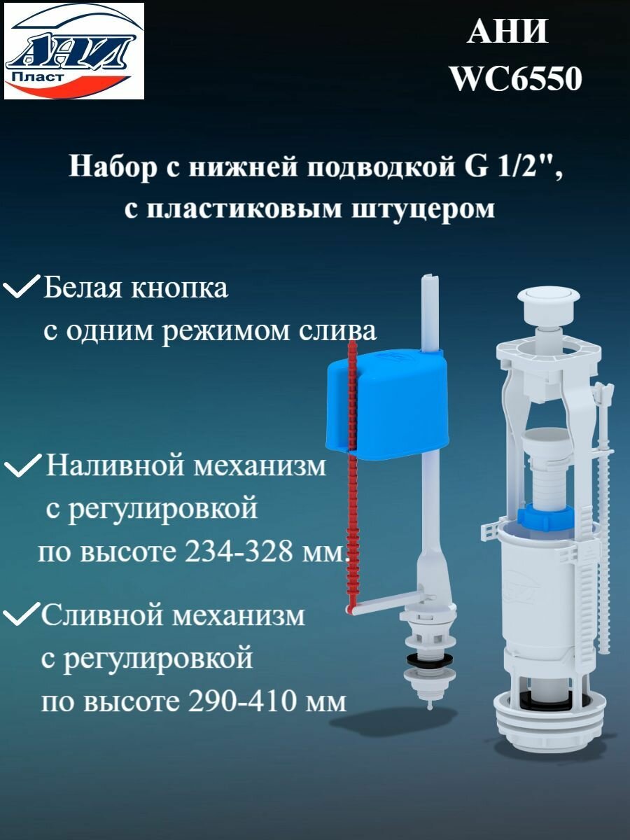 Набор АНИ Пласт WC6550 для бачка унитаза с нижней подводкой 1/2", с пласт. штуцером кнопка Белая эконом интересное: