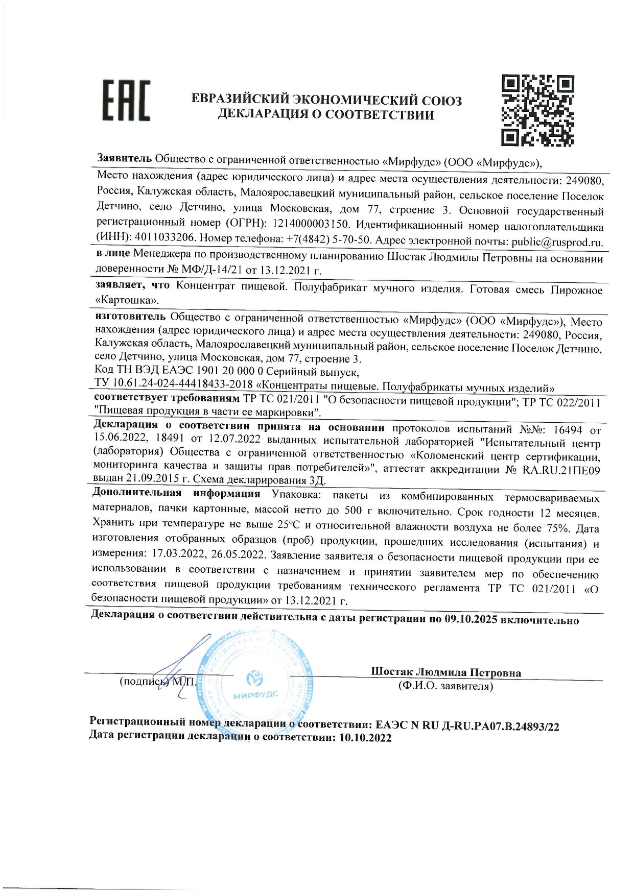 | Стандарты производства | соответствует требованиям ТУ 10.61.24-024-44418433 |