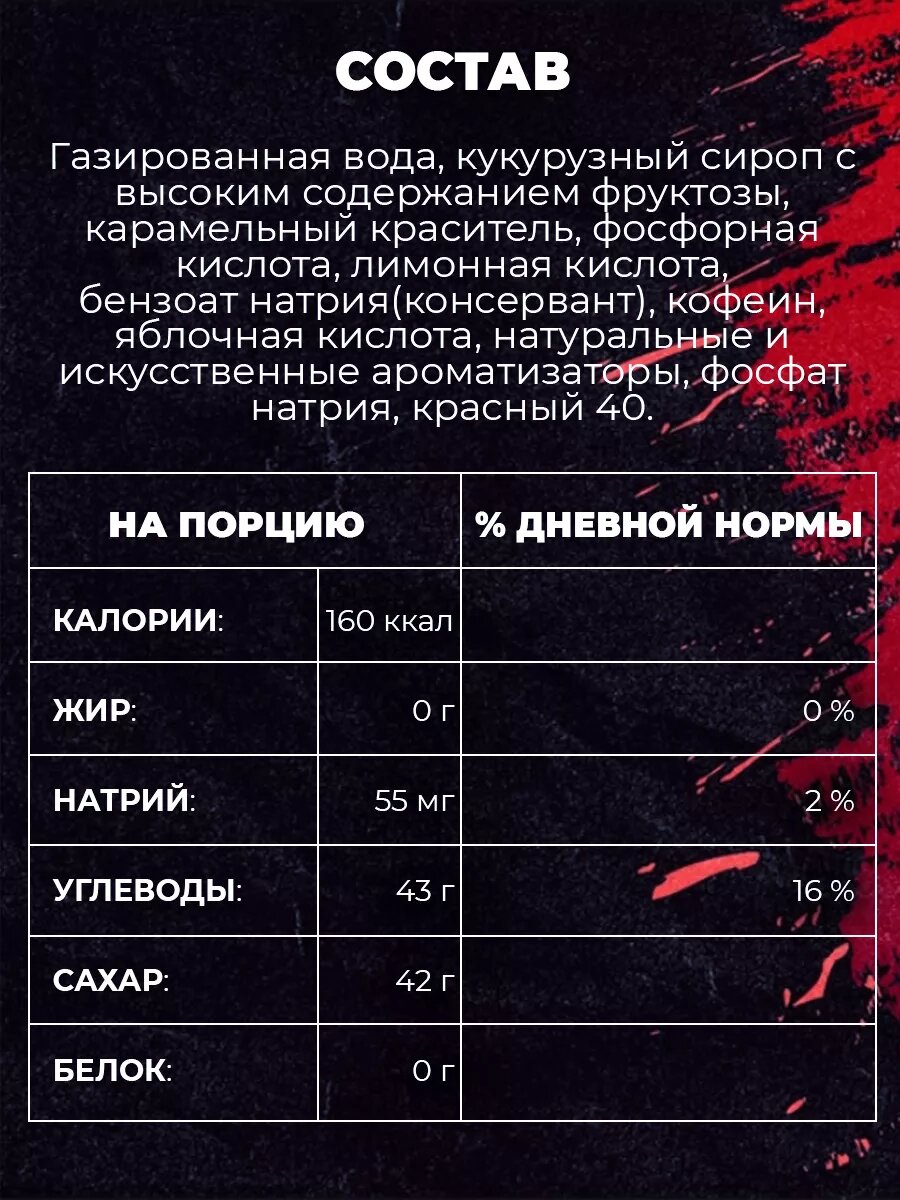 | Состав | вода, кукурузный сироп, краситель сахарный колер, ароматизатор, консервант бензоат натрия, регуляторы кислотности: лимонная, фосфорная и яблочная кислоты, кофеин, стабилизатор Е339, краситель красный очаровательный АС |