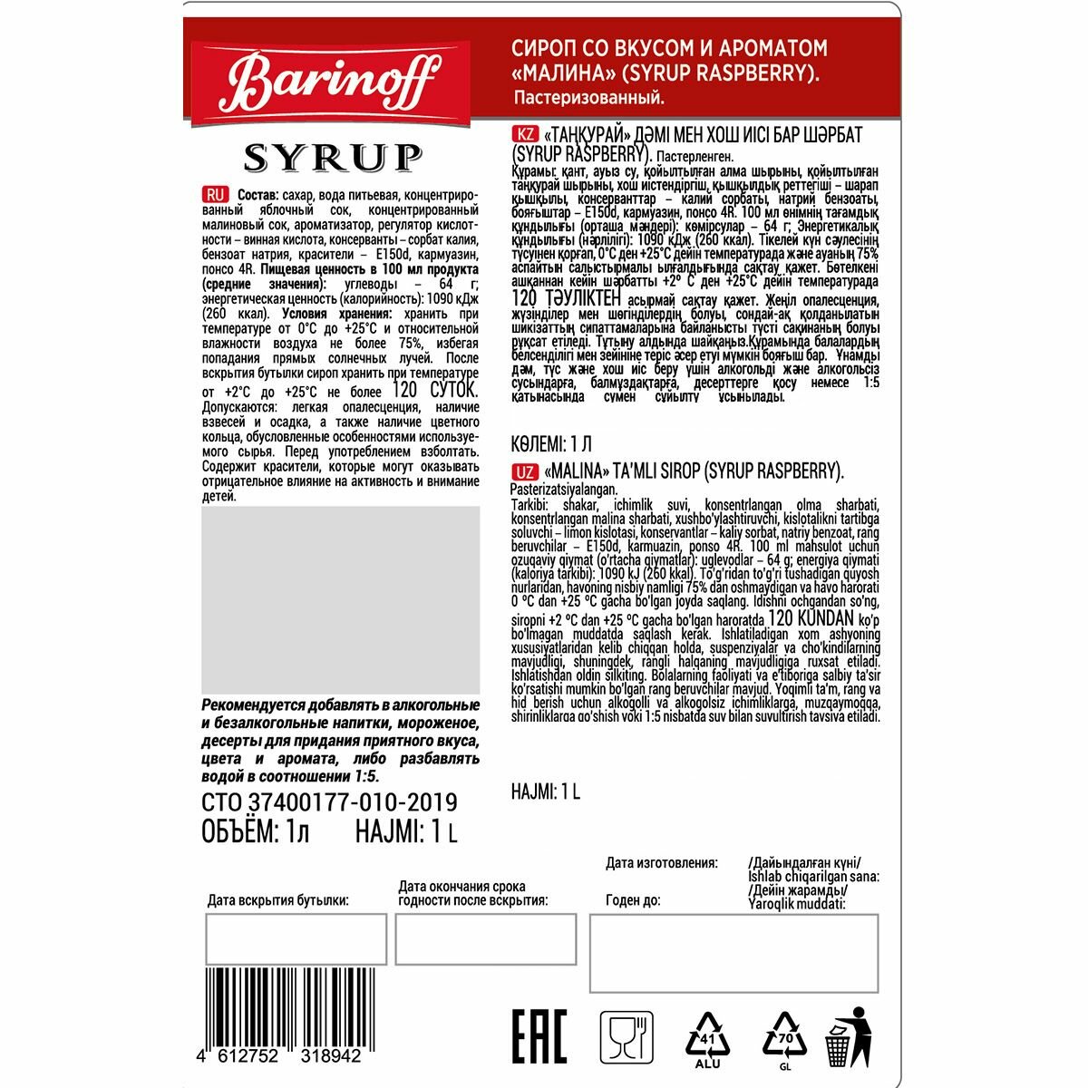 Сироп Barinoff Малина, для кофе и коктейлей, 1 л интересное: