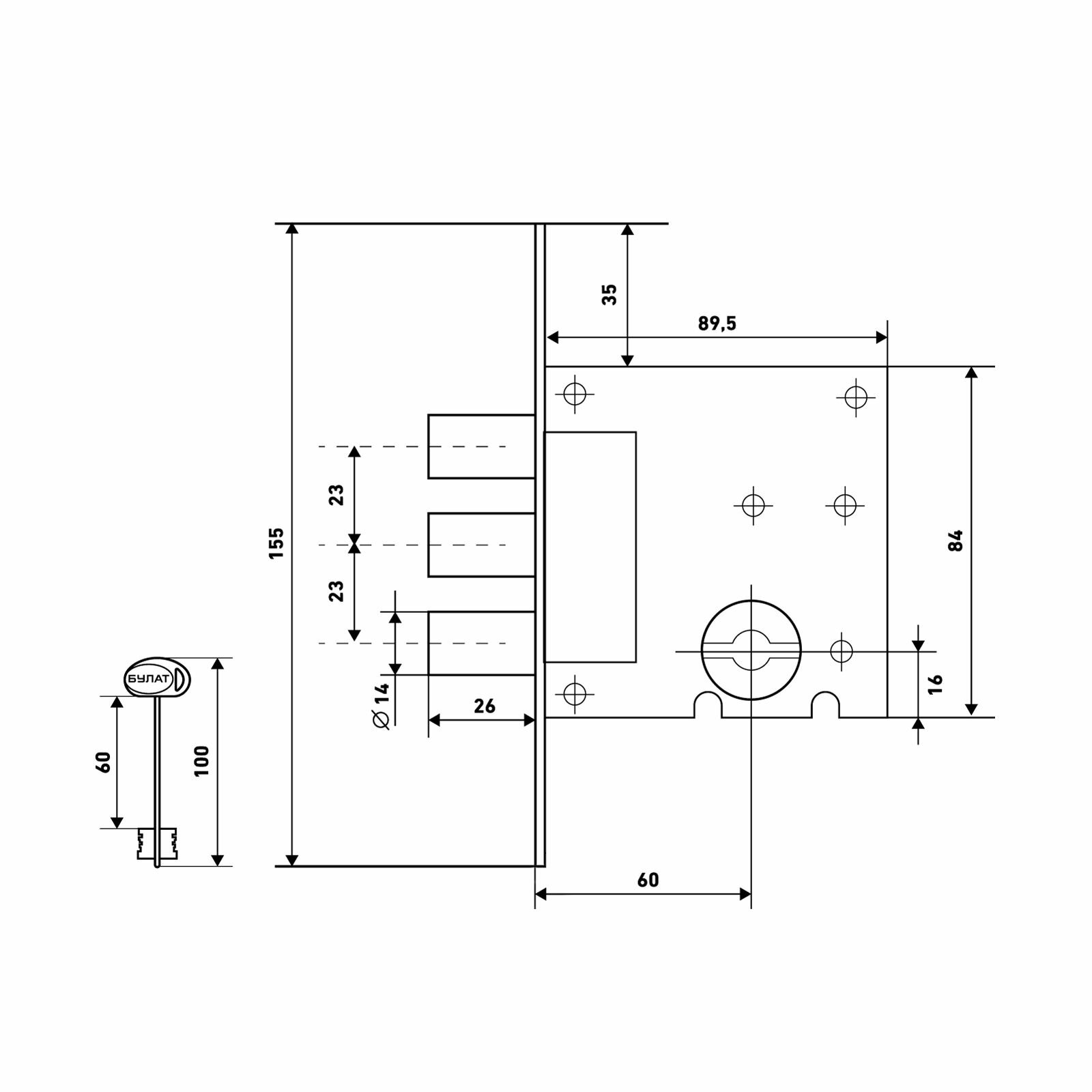 Замок врезной Булат, ЗВ8-6.60.00.3(14).08 Profi, 14 935, без ручки, сувальдный, для металлических дверей, хром