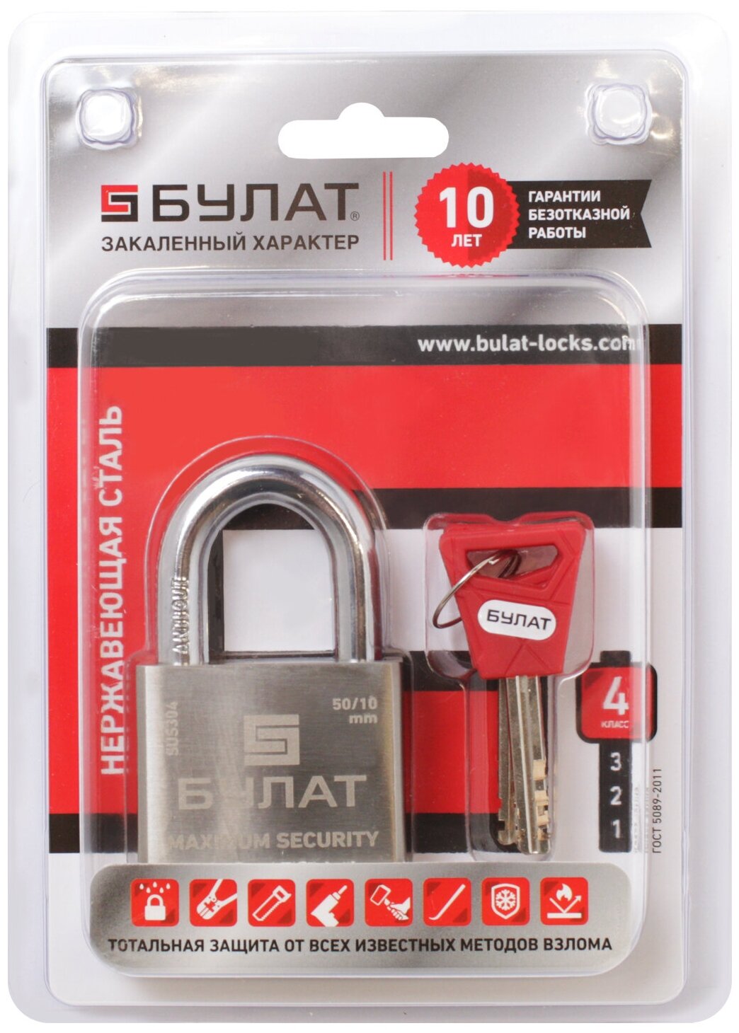 Замок навесной Булат Тотальная Защита ВС 3-С50 НС, нержавеющая сталь, дужка 10 мм для экстремальных условий и высочайшего уровня защиты