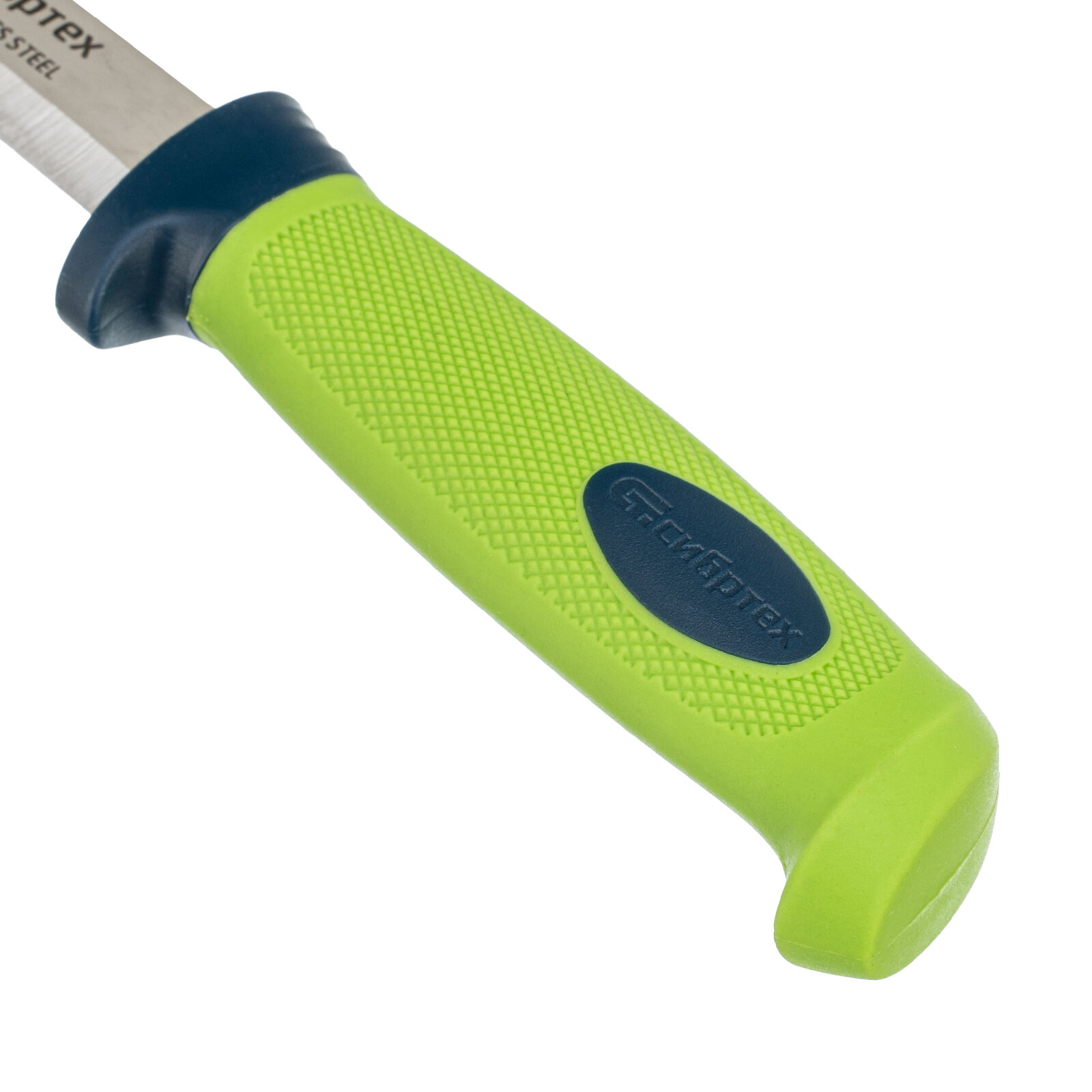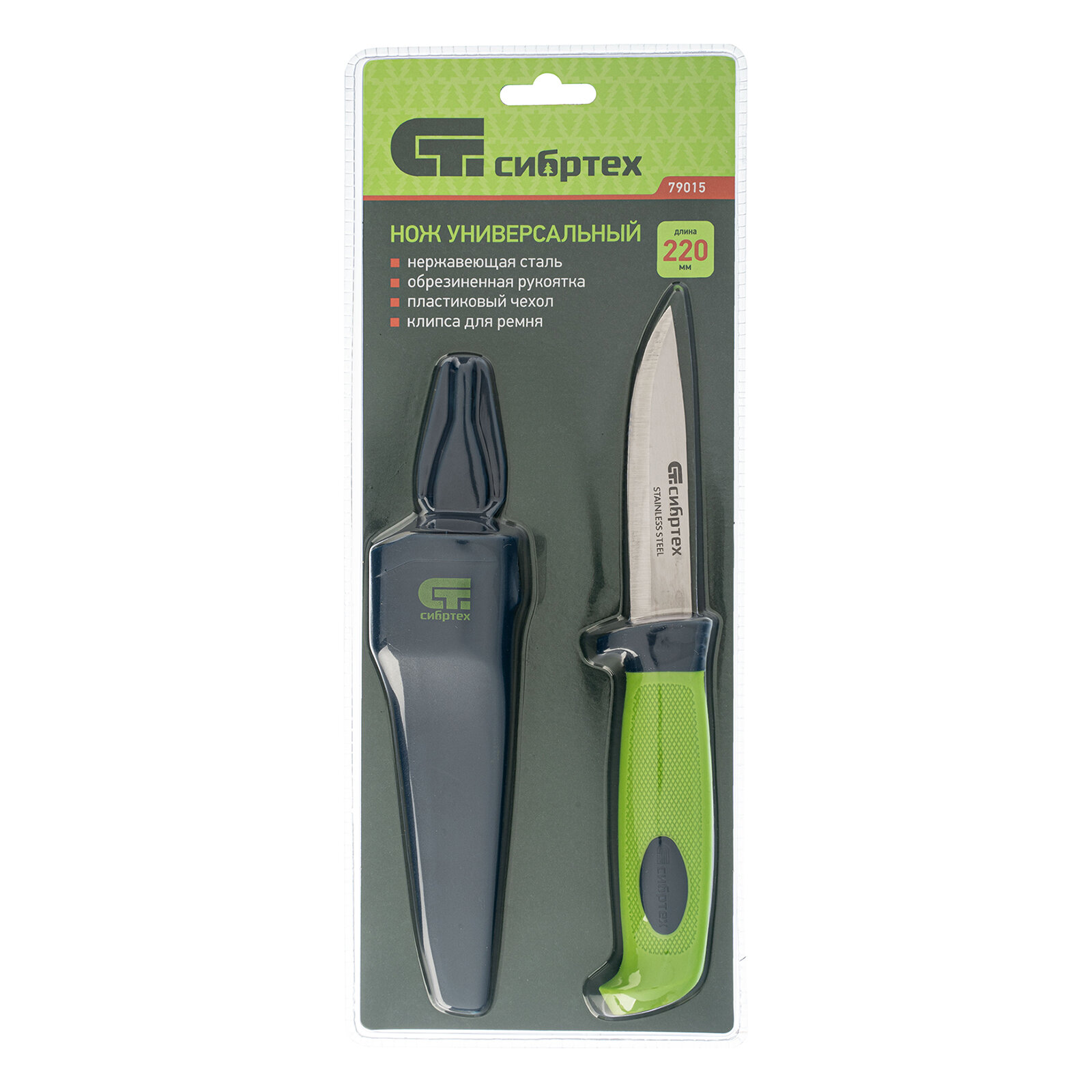Нож универсальный с чехлом, обрезиненная рукоятка, 220 мм, лезвие 100 мм Сибртех, 79015