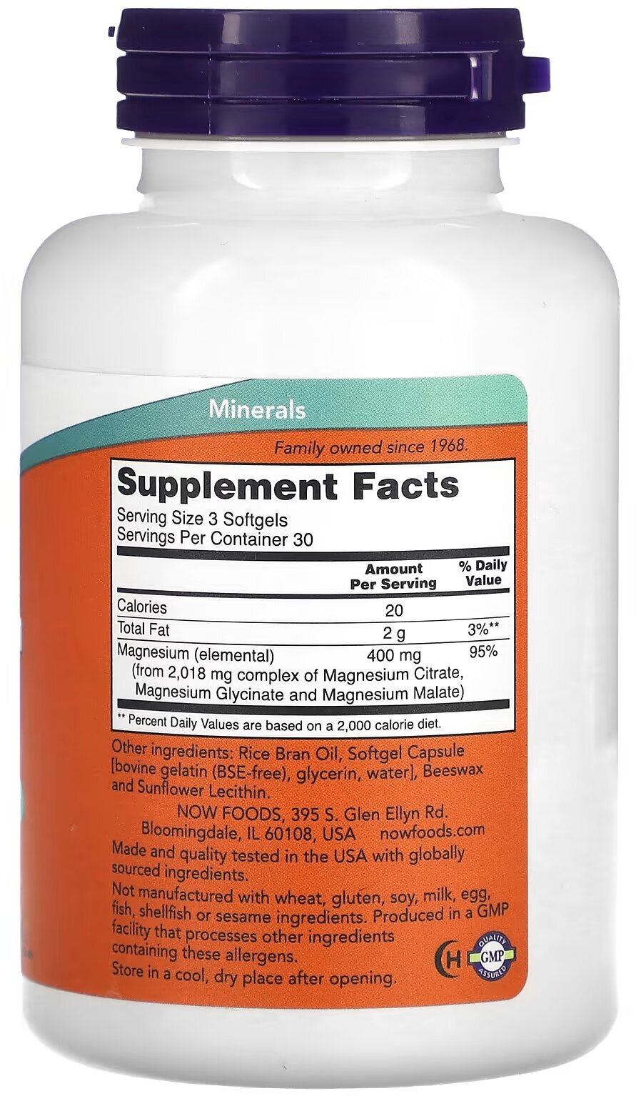 | Состав | Магний (элементарный) (из 2018 мг комплекса цитрата магния, глицината магния и малата магния),масло рисовых отрубей, капсула Softgel [бычий желатин (без BSE),глицерин, вода], пчелиный воск и лецитин подсолнечника. |
