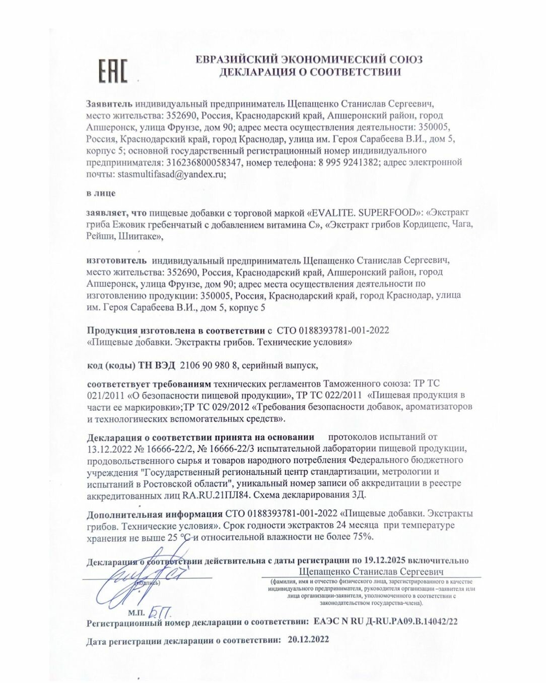 | Номер документа о соответствии | ЕАЭС N RU Д-RU.PA09.B.14042/22 |