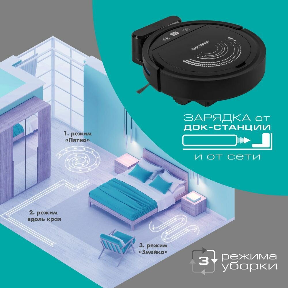 | Режимы | движение вдоль стен, движение зигзагом, движение по спирали, местная уборка, уборка по заданному маршруту |